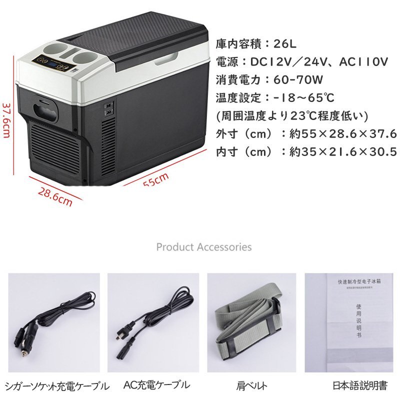 Product name: 26L冷温庫 ポータブル冷蔵庫 -10℃~+65℃調整 持ち運べる冷温庫 クーラーボックス 家庭用車載用 静音 12V/24V/110V USB充電口付 温度表示