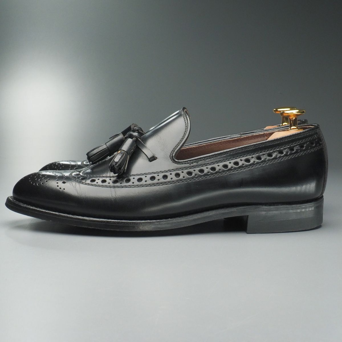 ハリ・光沢を併せ持つ黒のガラスレザーで形取られたウイングチップフロントのタッセルローファー