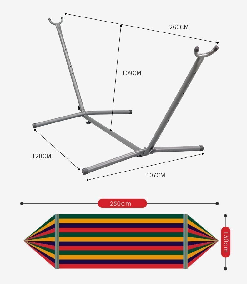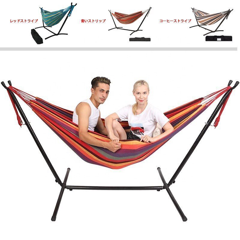 ●丈夫な帆布地を使用した自立式ハンモック、アウトドアで手軽にリゾート気分が味わえます