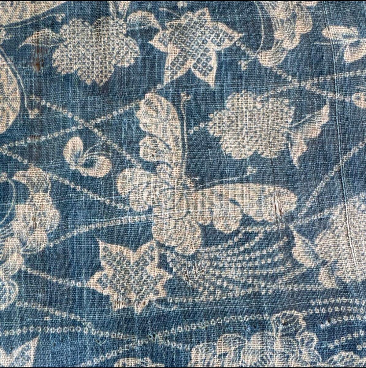 蝶々◆麻◆型染め◆珍品◆90×32㎝◆アンティーク◆ハギレ◆ボロはぎれ◆リメイク◆古布◆時代物◆