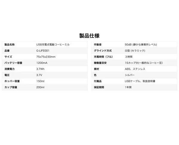 内 容 ■グッズライフ USB 充電式ポータブル電動コーヒーミル