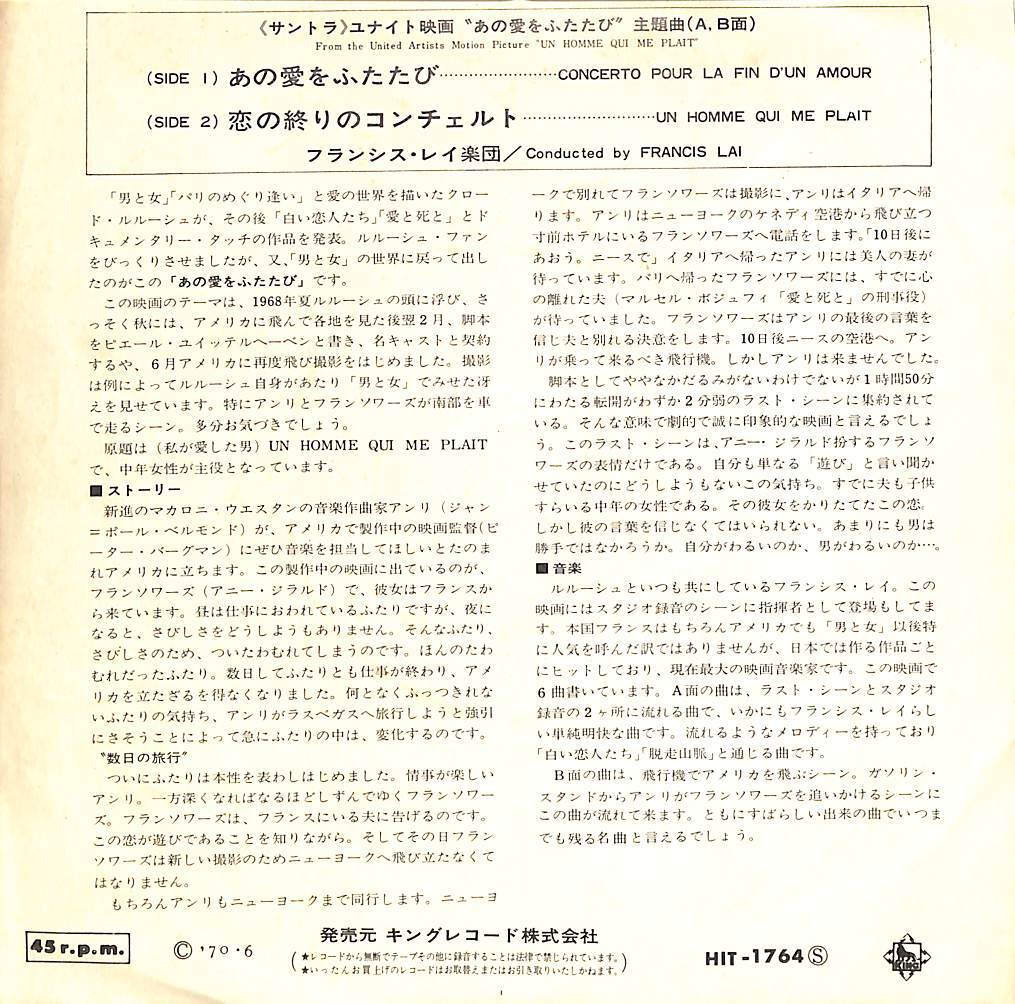 タイトルあの愛をふたたび Concerto Pour La Fin Dun Amour / 恋の終りのコンチェルト Un Homme Qui Me Plait (1970年・HIT-1764・サントラ)
