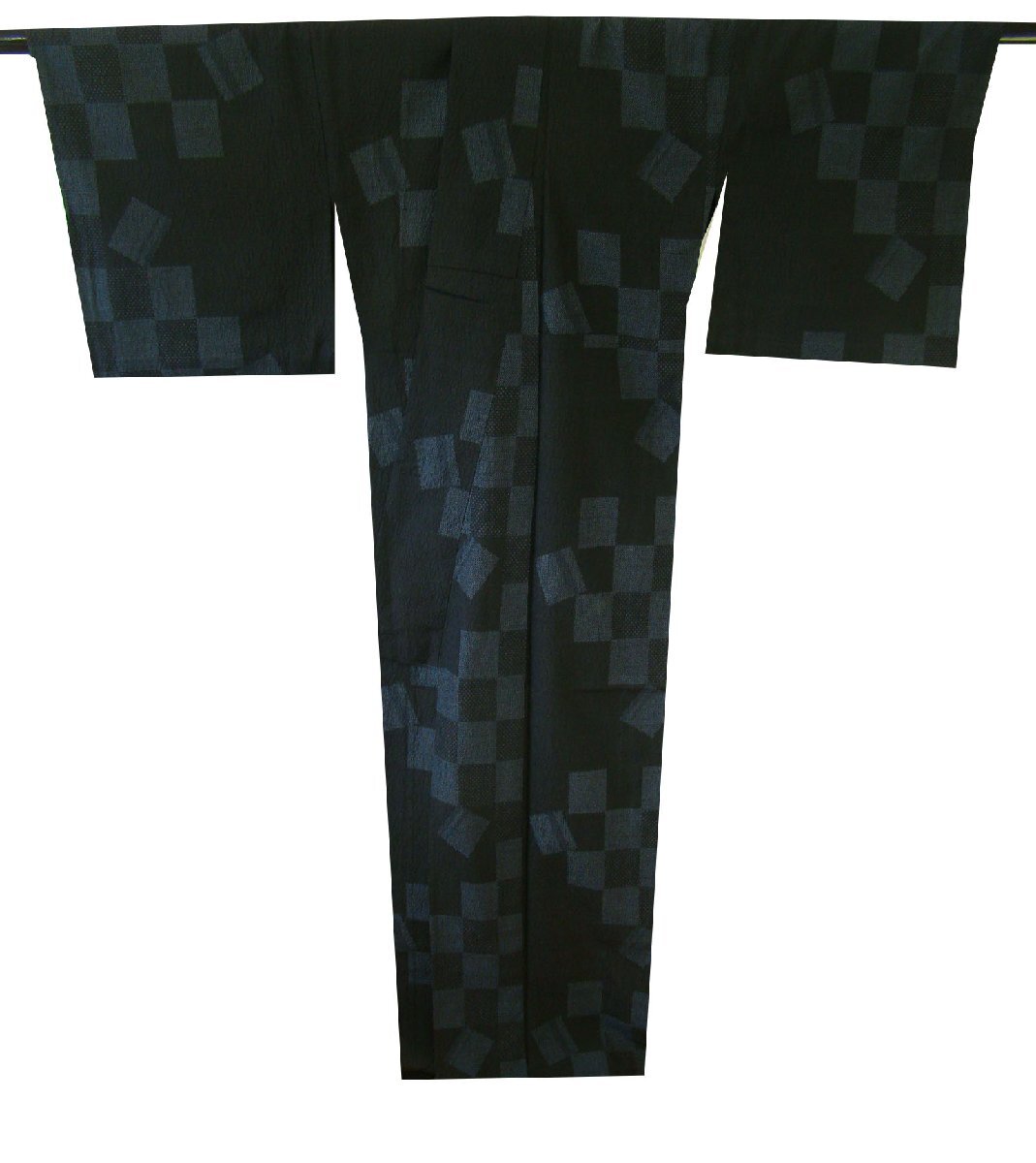濃紺色地に市松柄柄。  正絹居敷当て付。手縫い仕立。   証紙なし。