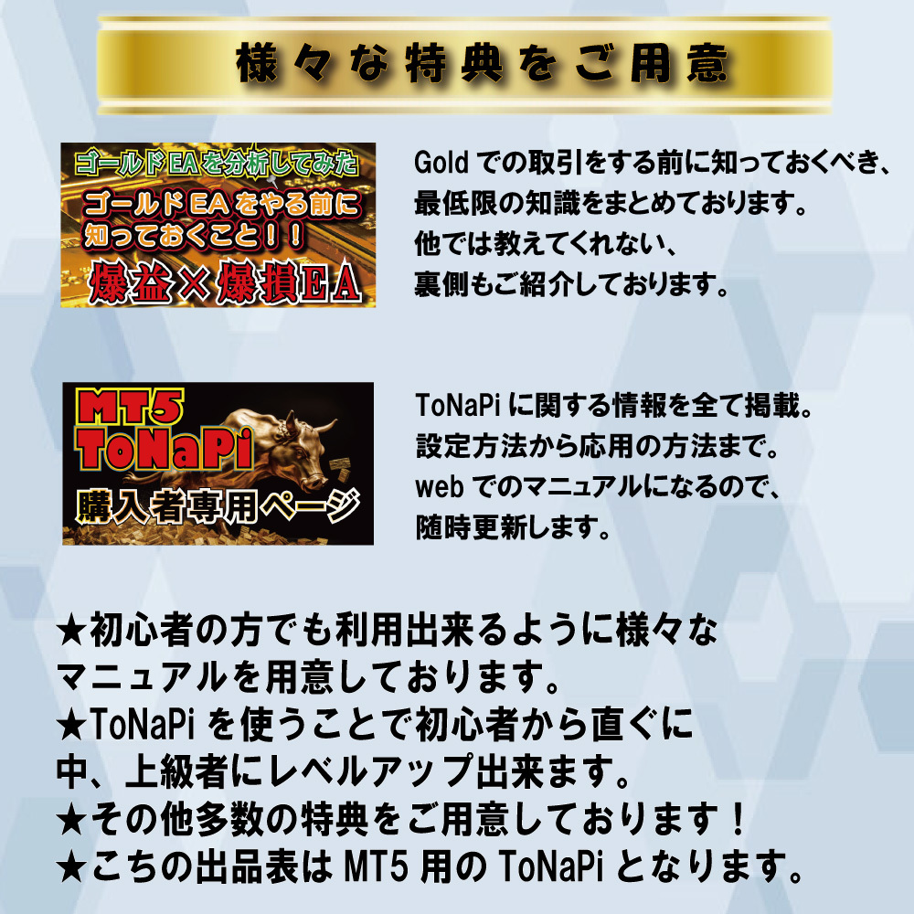 Product name: 【MT5 ToNaPi(となぴ)】 アルゴニズム取引 途中ナンピン EA 自動売買 FXトレード キャッシュバック ゴールド Gold 様々通貨ペア