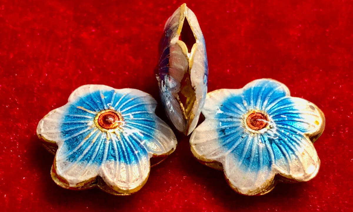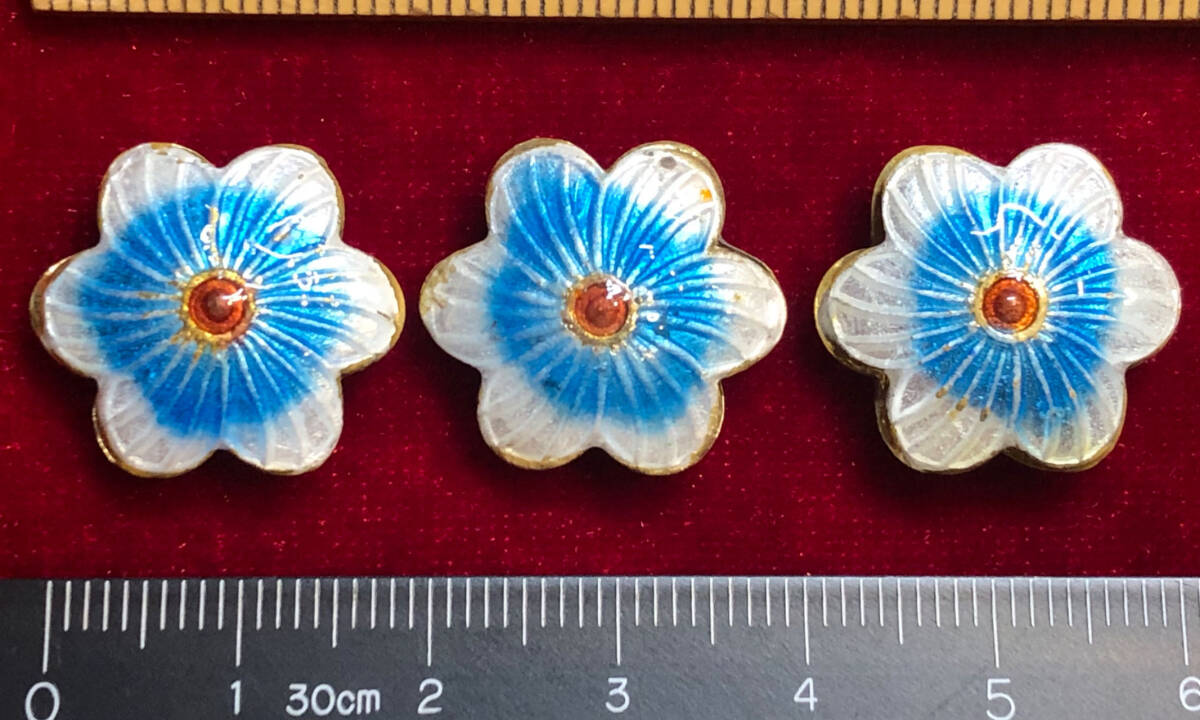 ¶!¶ 有線七宝焼ワールド - 3個の六弁花型ペンダント ¶!¶ 約厚8㎜×20㎜ 金線に白水色釉六弁花 手作り 手芸 工芸 インテリア ペンダント