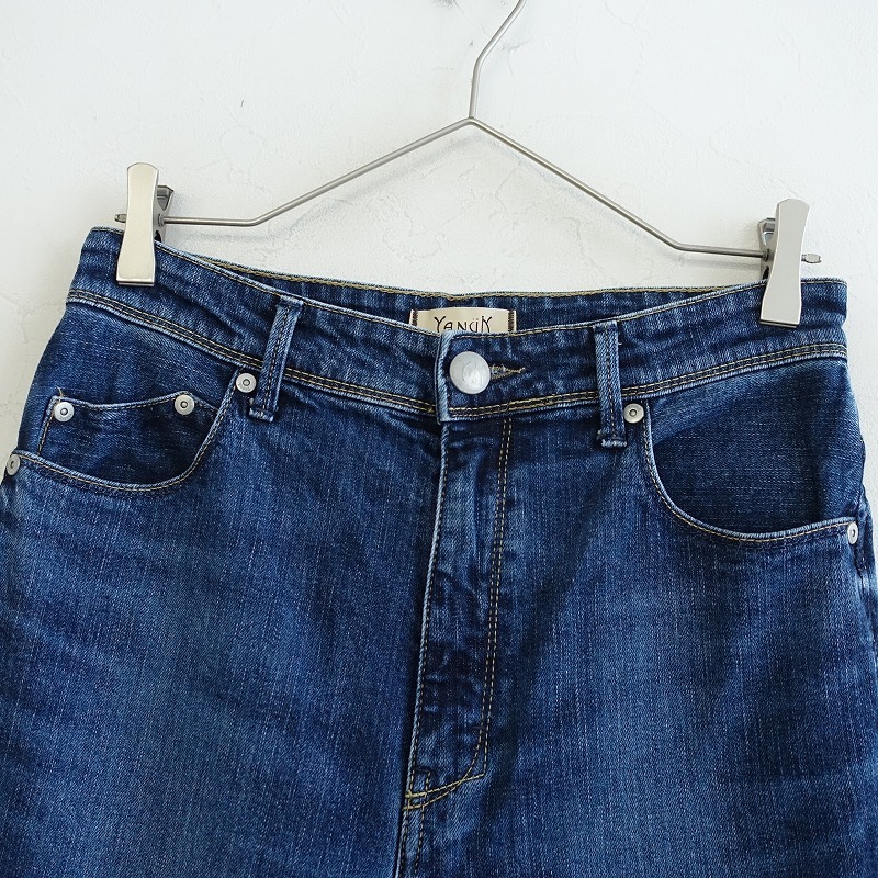 YANUKのコットンブレンドデニムパンツです。カラーはインディゴブルーで、少しストレッチの効いたデニム地で仕立てられています。開口部はボタンとジッパーで、コインポケットを含む5ポケット付きです。定価(メーカー希望小売価格) 28,600円の商品です。