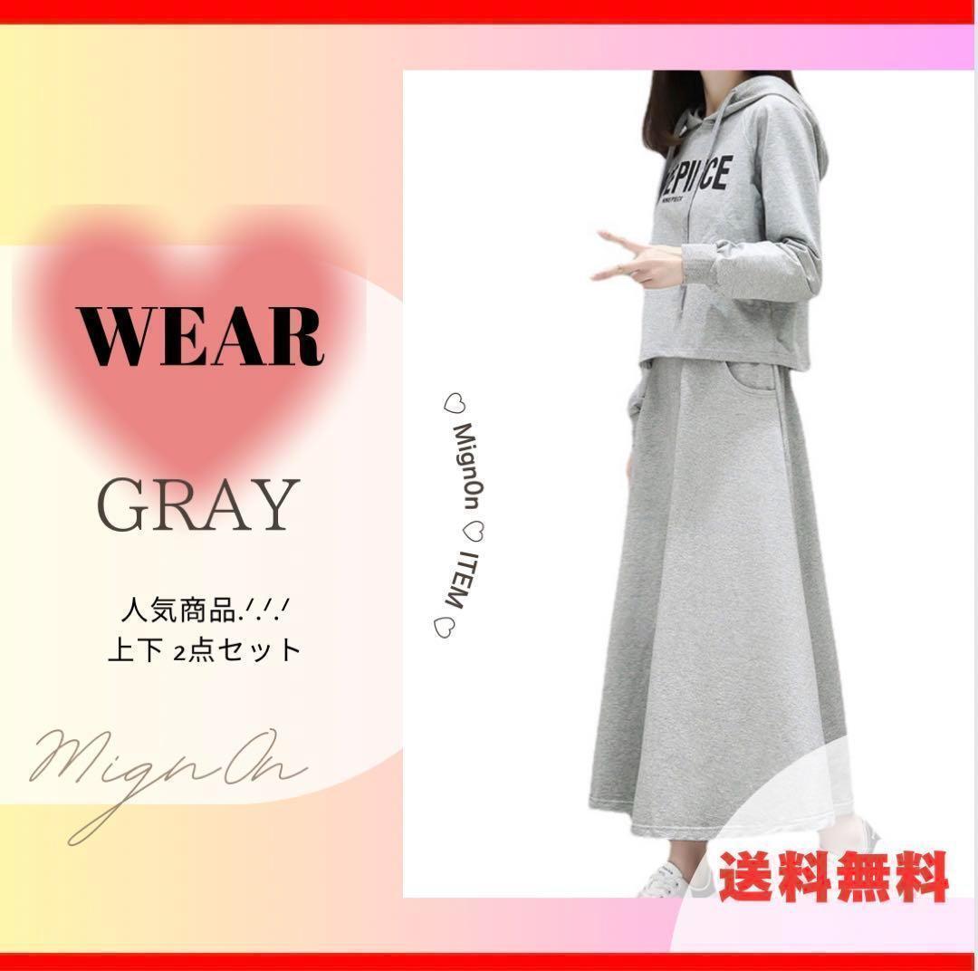 セットアップ【グレー L】上下 2点 ウェア パーカー 部屋着 ジャージ ルームウェア セット ロング スカート ウェア ロンスカ 186