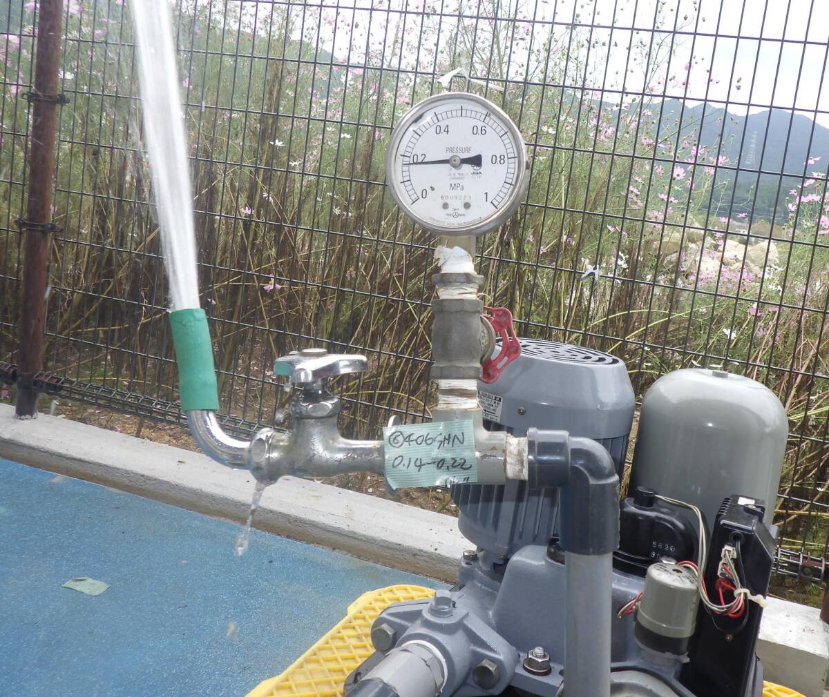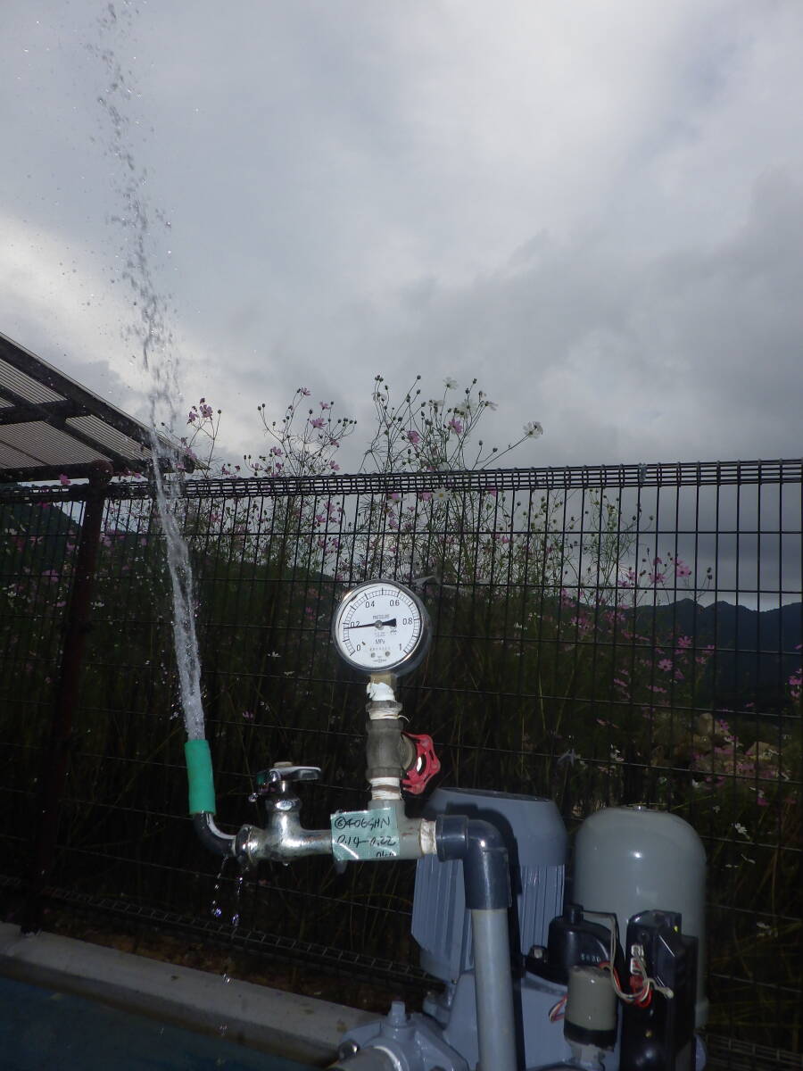 仮配管で水面が3m下の井戸より吸上げ、吐出、自動停止の動作確認しております。