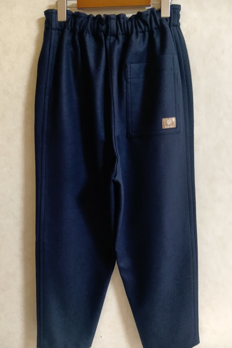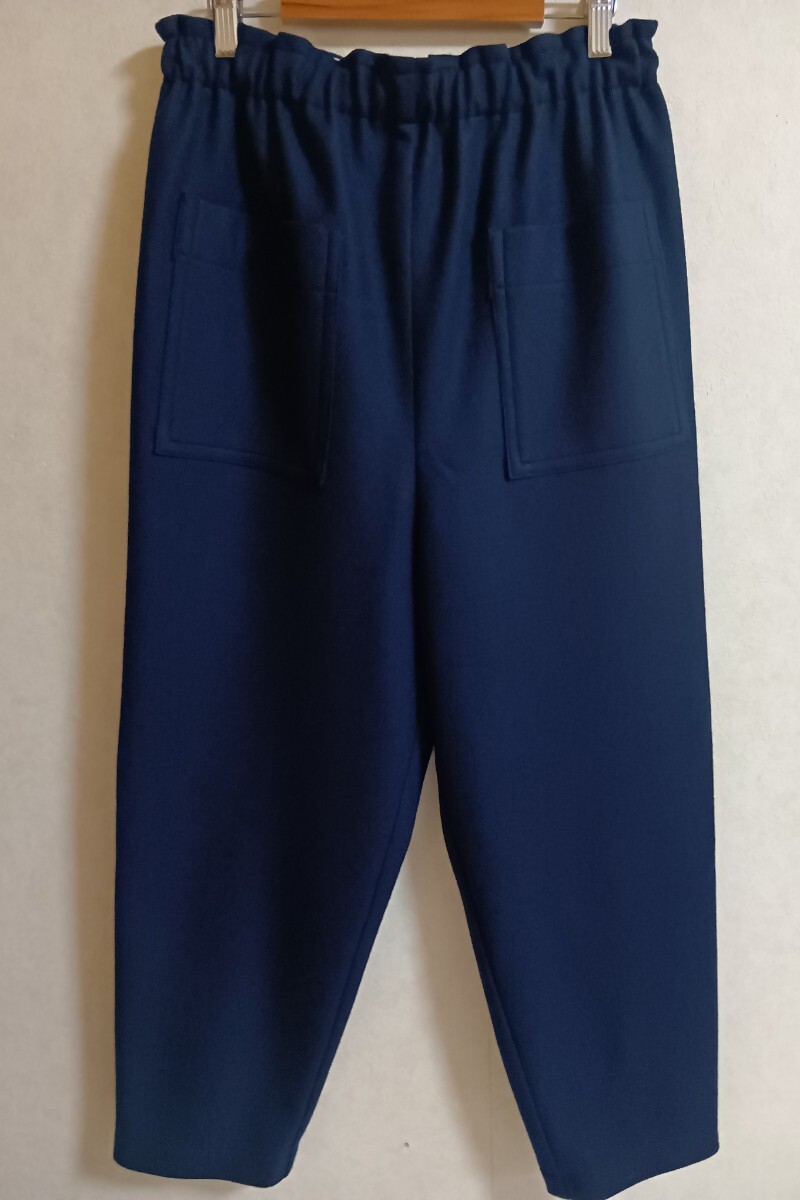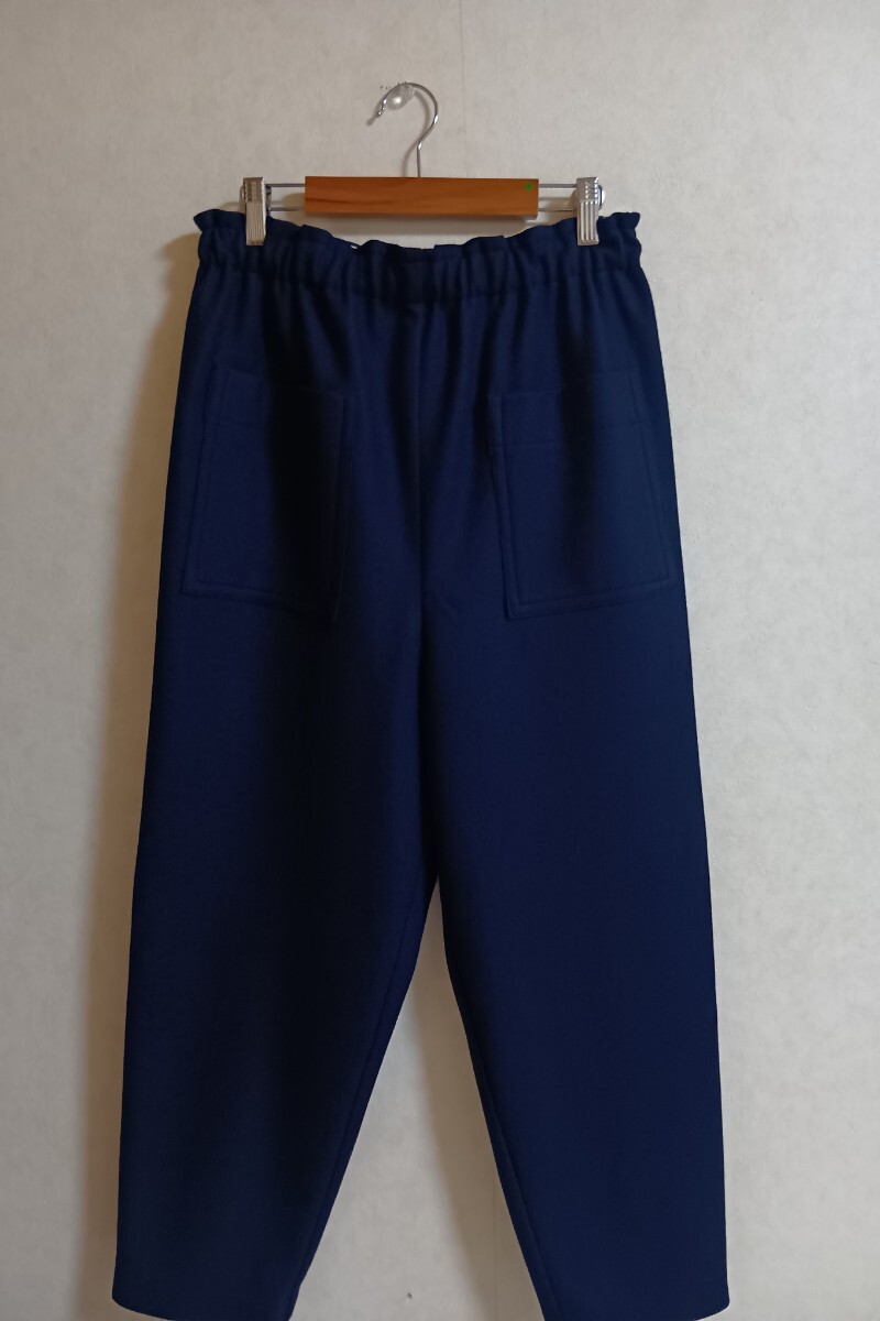 濃紺の、中肉厚ウール圧縮ニットで仕立てました。圧縮ニットなので伸縮は少なく、ストレッチパンツの様です。 股上が深めで腰をゆったり包んでいて、裾に向かってほっそりとしたシルエットです。 前にでかポケットふたつ、後ろにもタグ付きのでかポケットがあります。 わたり巾と股上にゆとりのある、ゆったり着ていただけるパンツです。ウエストはゴム穴があり交換、調節可能です。MLサイズ対応ですが採寸を参考にしてください。ウエスト104cmでゴム68cm、ヒップ104、股上35、股下61、総丈96、渡り巾34、膝巾28、裾巾18、です。多少の誤差有。