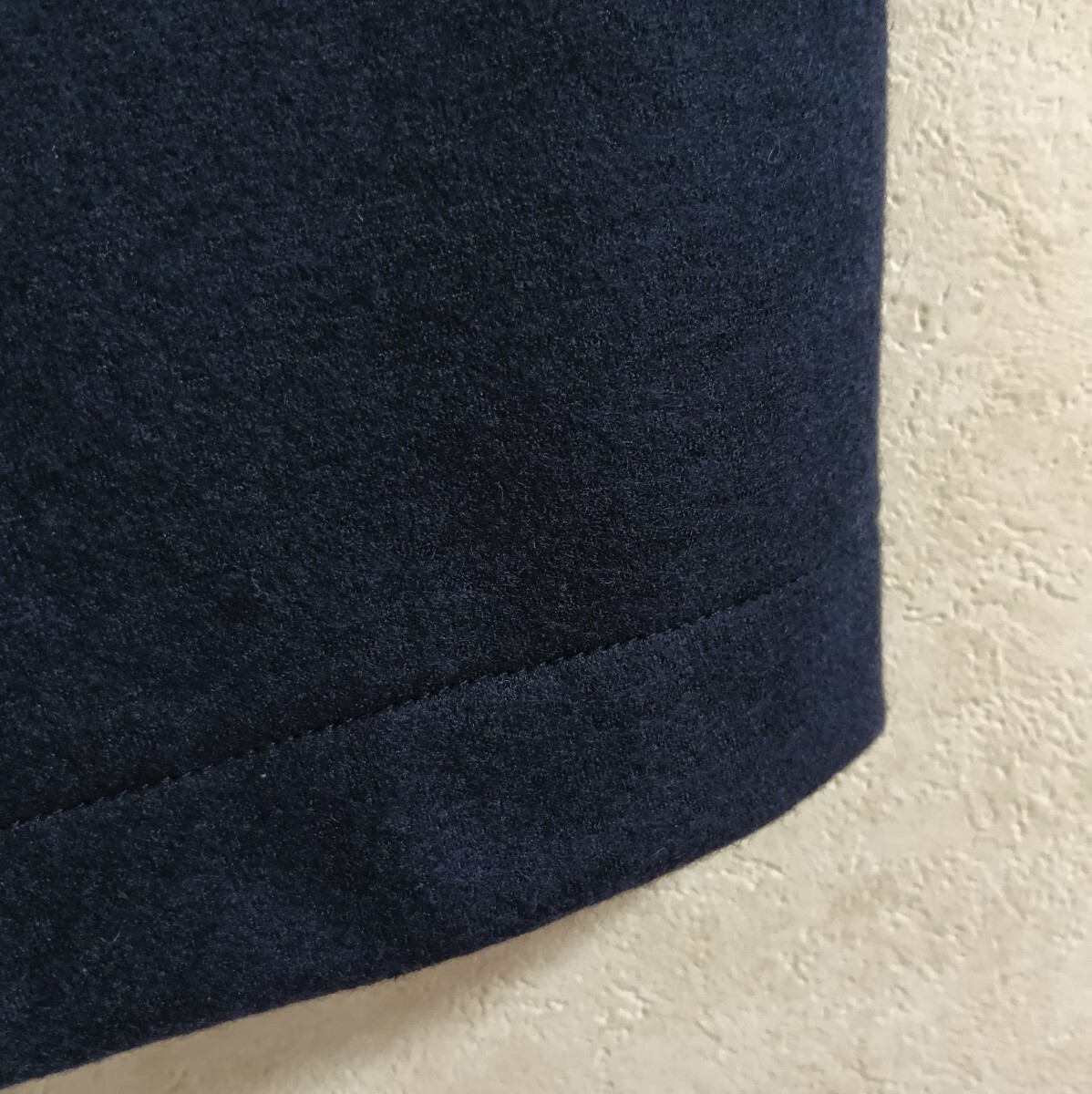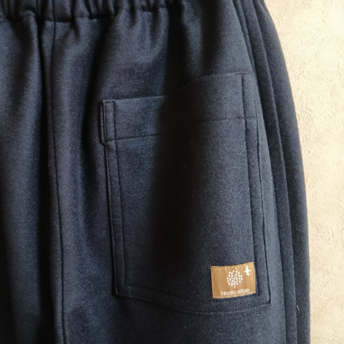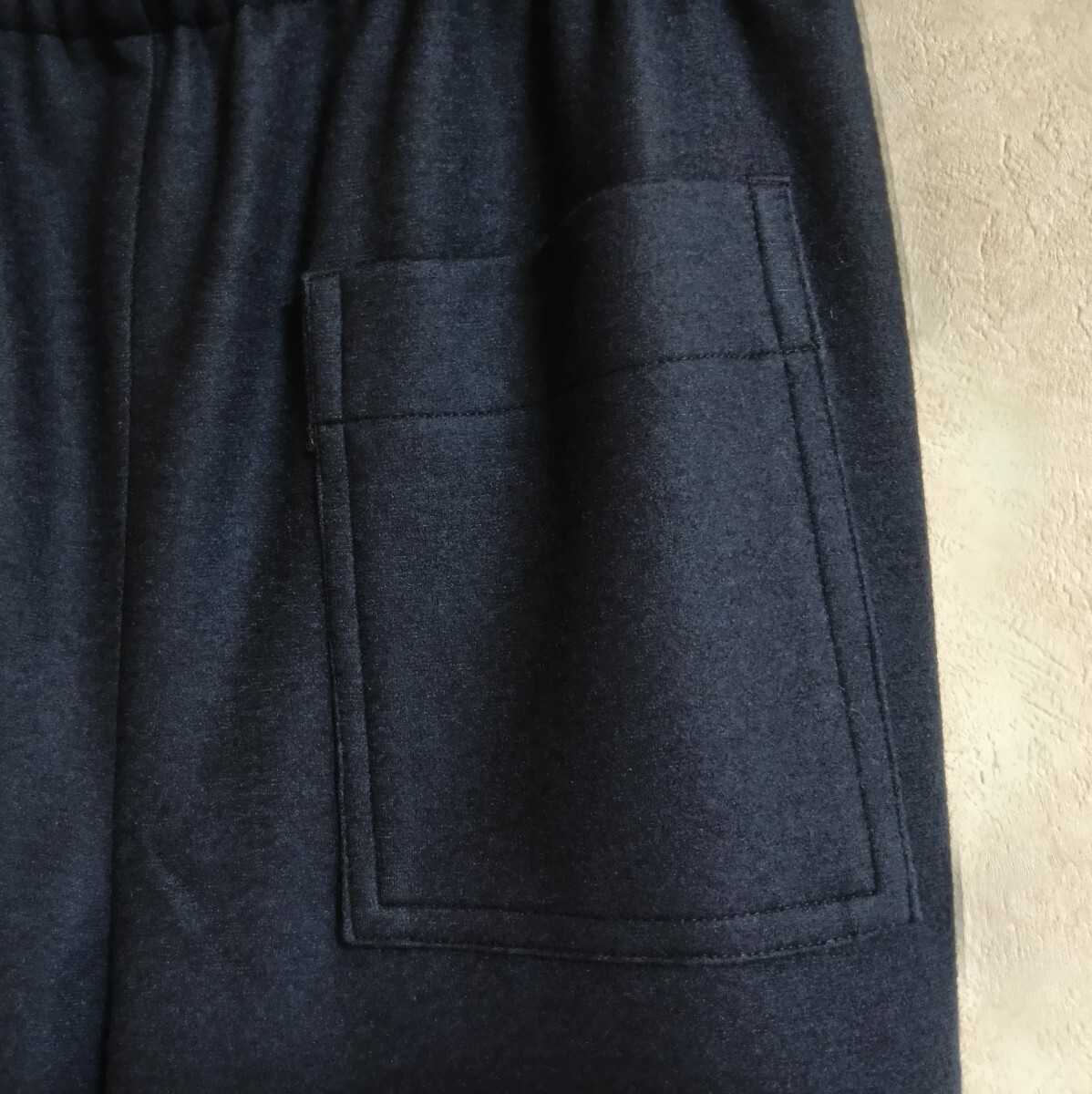 濃紺の、中肉厚ウール圧縮ニットで仕立てました。圧縮ニットなので伸縮は少なく、ストレッチパンツの様です。 股上が深めで腰をゆったり包んでいて、裾に向かってほっそりとしたシルエットです。 前にでかポケットふたつ、後ろにもタグ付きのでかポケットがあります。 わたり巾と股上にゆとりのある、ゆったり着ていただけるパンツです。ウエストはゴム穴があり交換、調節可能です。MLサイズ対応ですが採寸を参考にしてください。ウエスト104cmでゴム68cm、ヒップ104、股上35、股下61、総丈96、渡り巾34、膝巾28、裾巾18、です。多少の誤差有。