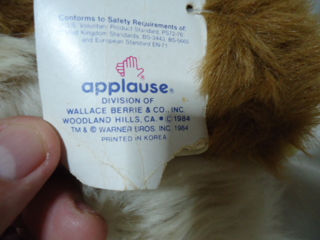米国にて、個人の方より、購入しました。1984年製。紙タグ・タグ付き。ワーナーブラザーズ・アプローズ社製。ぬいぐるみ製。両目・鼻のみ、プラスチック製・口のみ、刺繍です。サイズは、縦約28センチ・両耳幅約29センチです。ヴィンテージ物なので、少々薄汚れあります。ヴィンテージ物なので、ご理解のある方・24時間以内に、お手続き入力後、期限内にかんたん決済、出来る方のみ、ご入札をお願い致します。この商品は、1点物です。 2512                          ※※発送方法・送料は、特定記録付き定形外郵便(追跡可能・補償無し)ですと、870円又は、簡易書留郵便(追跡可能・手渡し配達・補償有り)ですと、1010円又は、ゆうパック送料着払い便(持ち込み割引有り・追跡可能・手渡し配達・補償有り・かんたん決済時は、送料0円ですが、送料のみ到着時支払い)です。※※    ☆★★★★★☆送料は、変わりますが、何点でも、同梱包可能です。数点落札されましたら、まとめて取引を、選択お願いします。☆★★★★★☆