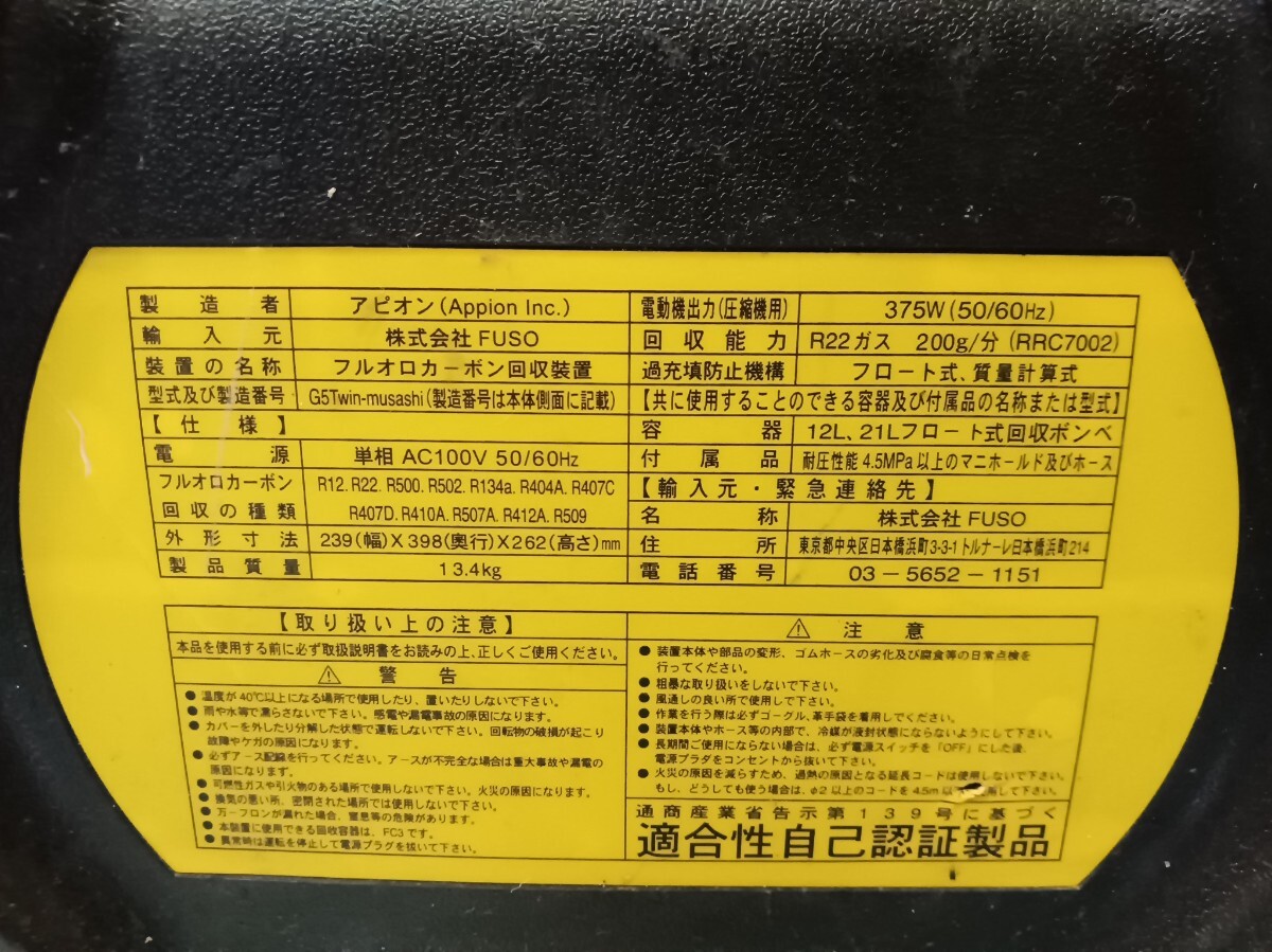 Product name: Appion アピオン フロンガス 回収機 G5 Twin-musashi II 武蔵 2 フルオロカーボン回収装置 通電確認済み ジャンク