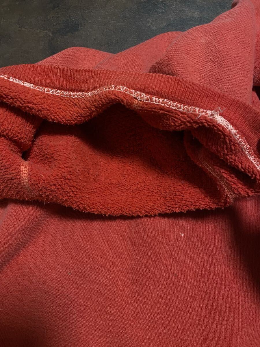 60年代のヴィンテージスウェットになります。赤が程よくフェードしていてとてもかっこ良いです。人気な赤黒でフロッキープリントです。タグは欠損しています。身幅もたっぷりあり、生地が肉厚でまだまだ着れます。お好きな方はぜひ。