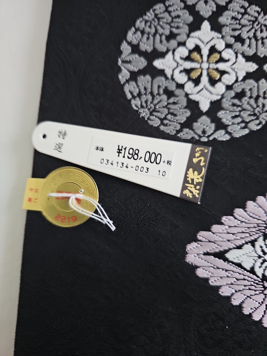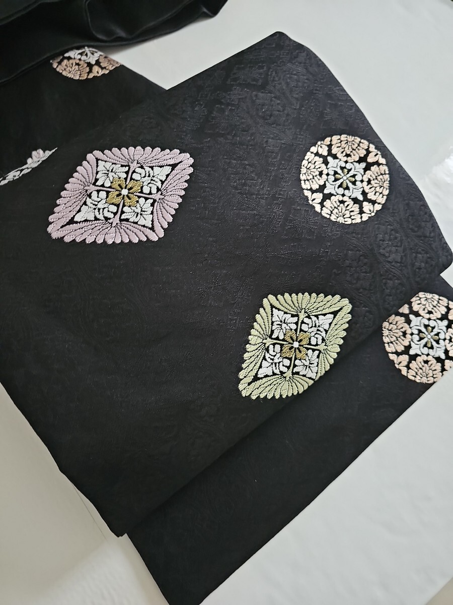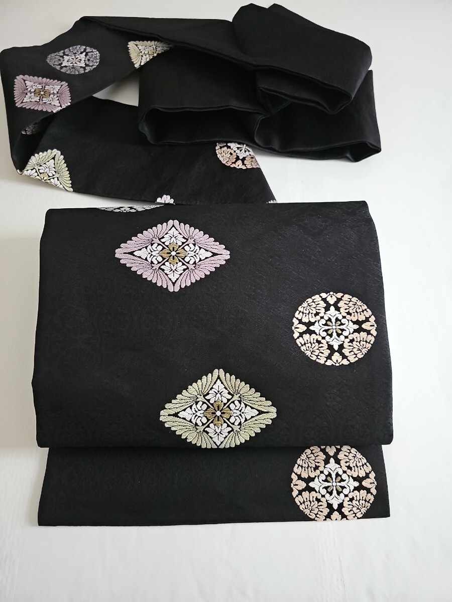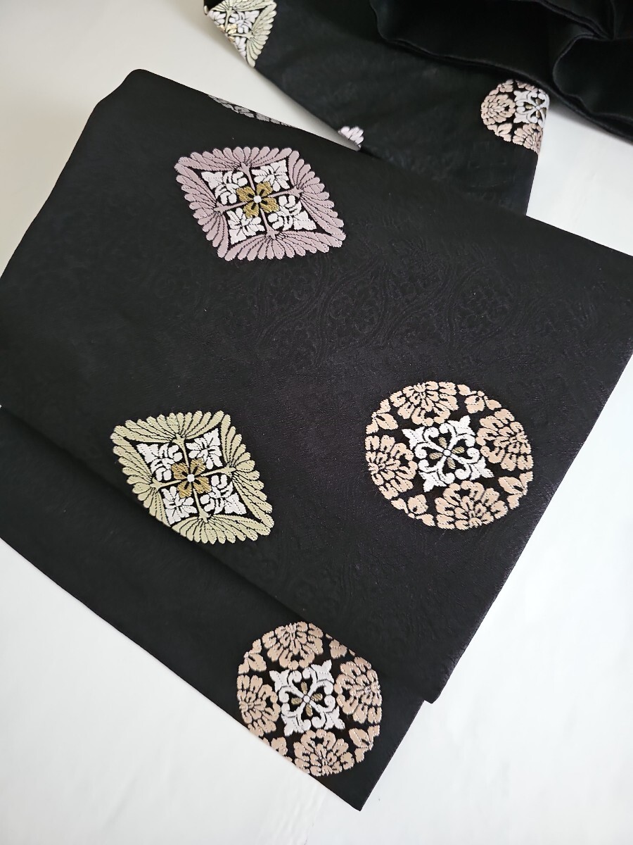 良い塩梅の張りと柔らかさを有する織地、黒、織地文様、金糸使いの花菱文様刺繍を施しながら表現したシックな華麗さが魅力的な上等なお品ものでございます。