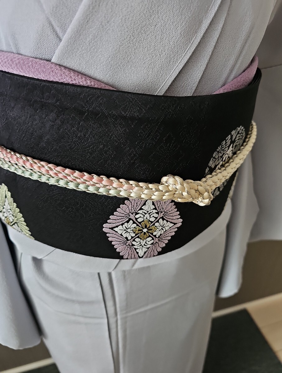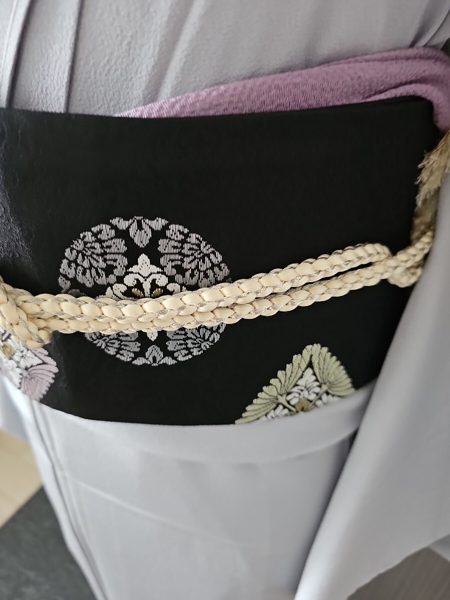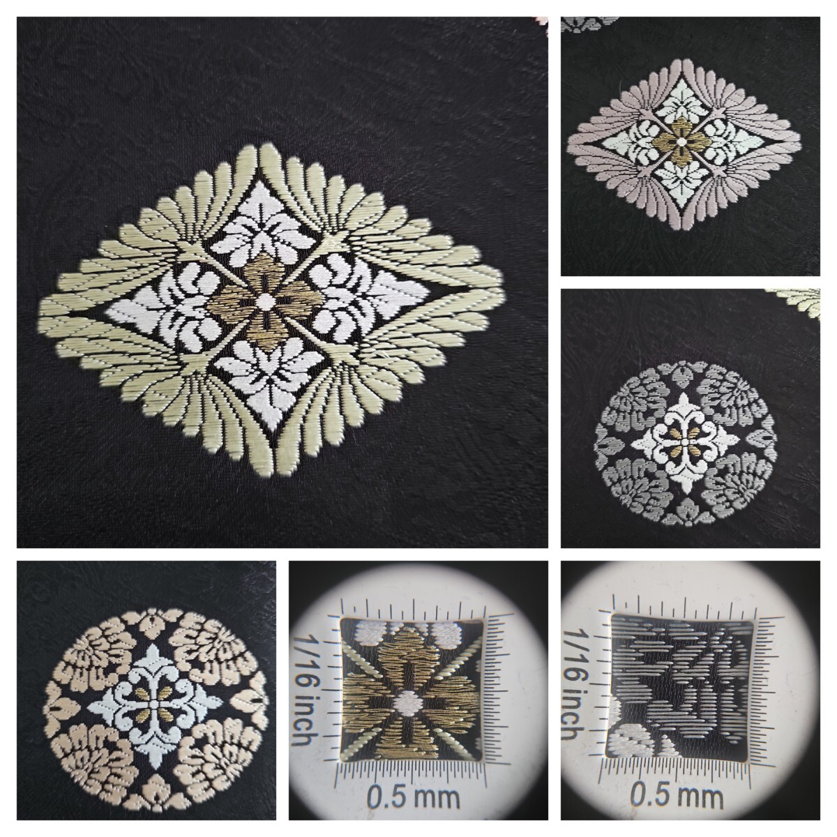 良い塩梅の張りと柔らかさを有する織地、黒、織地文様、金糸使いの花菱文様刺繍を施しながら表現したシックな華麗さが魅力的な上等なお品ものでございます。