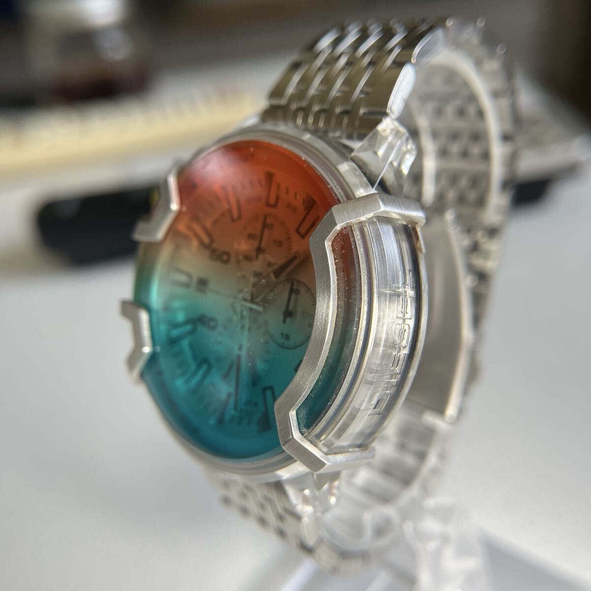 未使用に近い美品 DZ4521 DIESEL ステンレスベルト新品に交換 電池新品交換 ディーゼル クロノグラフ正常作動 カラーガラス