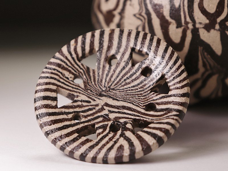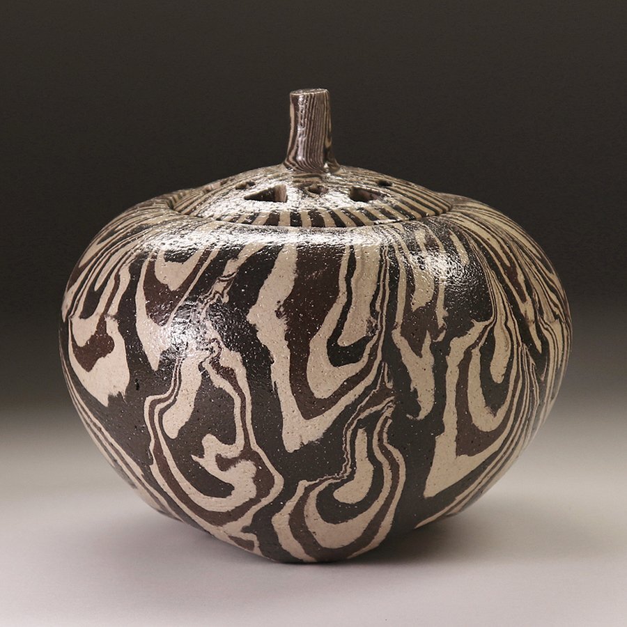 白・茶・黒の陶土を重ね、層状の文様を生む伝統技法「練り込み」による香炉。 胴部は丸みを帯び、大小不規則な文様が自然の景色を思わせる構成で展開されておりますが、 削りによって形作られた三足の短い足や、火舎の○・△の透かしなど、細部に至るまで緻密な造形が施され、 技術の確かさと美意識が感じられる作品です。
