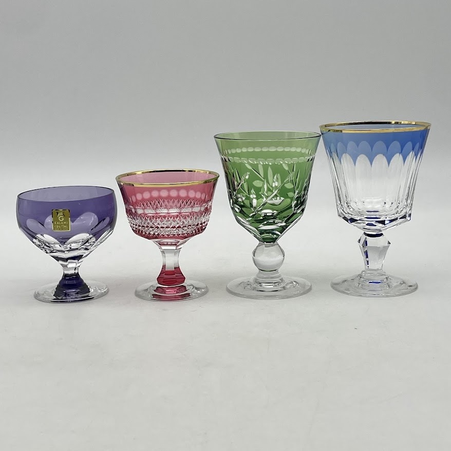 ★sm2410 カガミクリスタル 江戸切子 懐石杯 4個セット 金縁 ピンク 緑 青 紫 ワイン カクテル グラス 酒器 ガラス 食器★