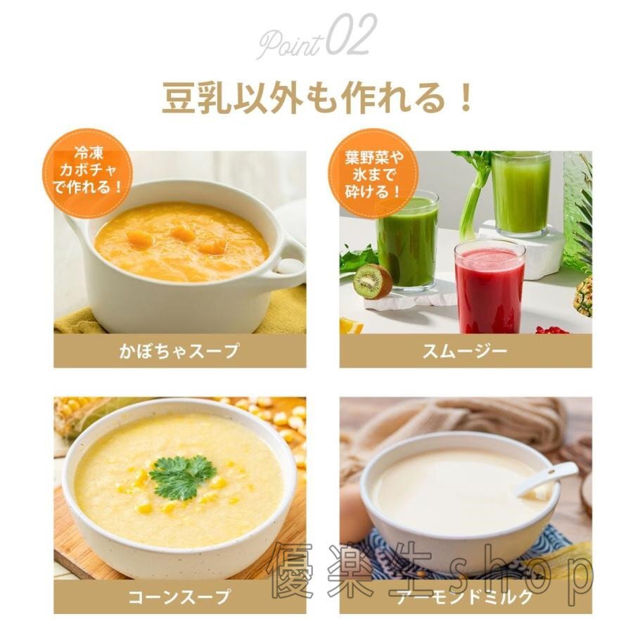 適用対象:豆乳や新鮮なフルーツジュースの製造は健康的な選択肢です。豆乳が好きな人、果物や野菜が好きでない子供、栄養を手軽に補いたい人、赤ちゃん用の食品を作る人、歯が弱いお年寄りのために食事を作る人などにおすすめです
