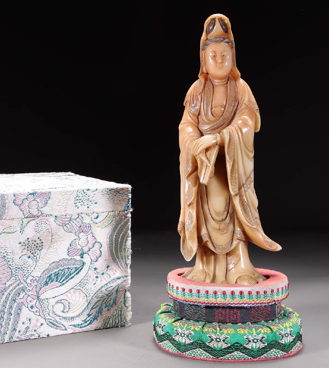 Product name: 【安】清時代 尚均銘 寿山芙蓉石彫 経巻観音立像 共箱 極細工 古置物 古擺件 中国古美術 時代物 330