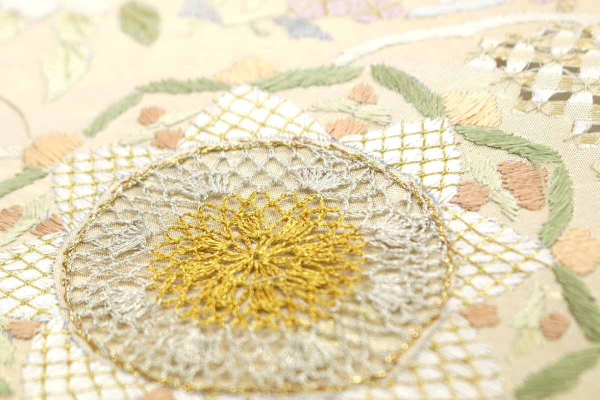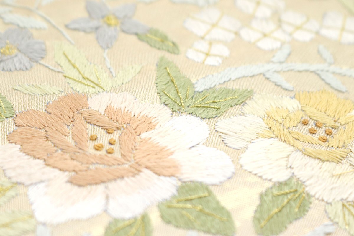 金銀糸や白色、薄水色、灰藤色、柳色、薄ピンク色などのお色目で花模様が豪華な蘇州刺繍にて表現されております。道長取りのような形で汕頭刺繍が施されており、アクセントとなっております。