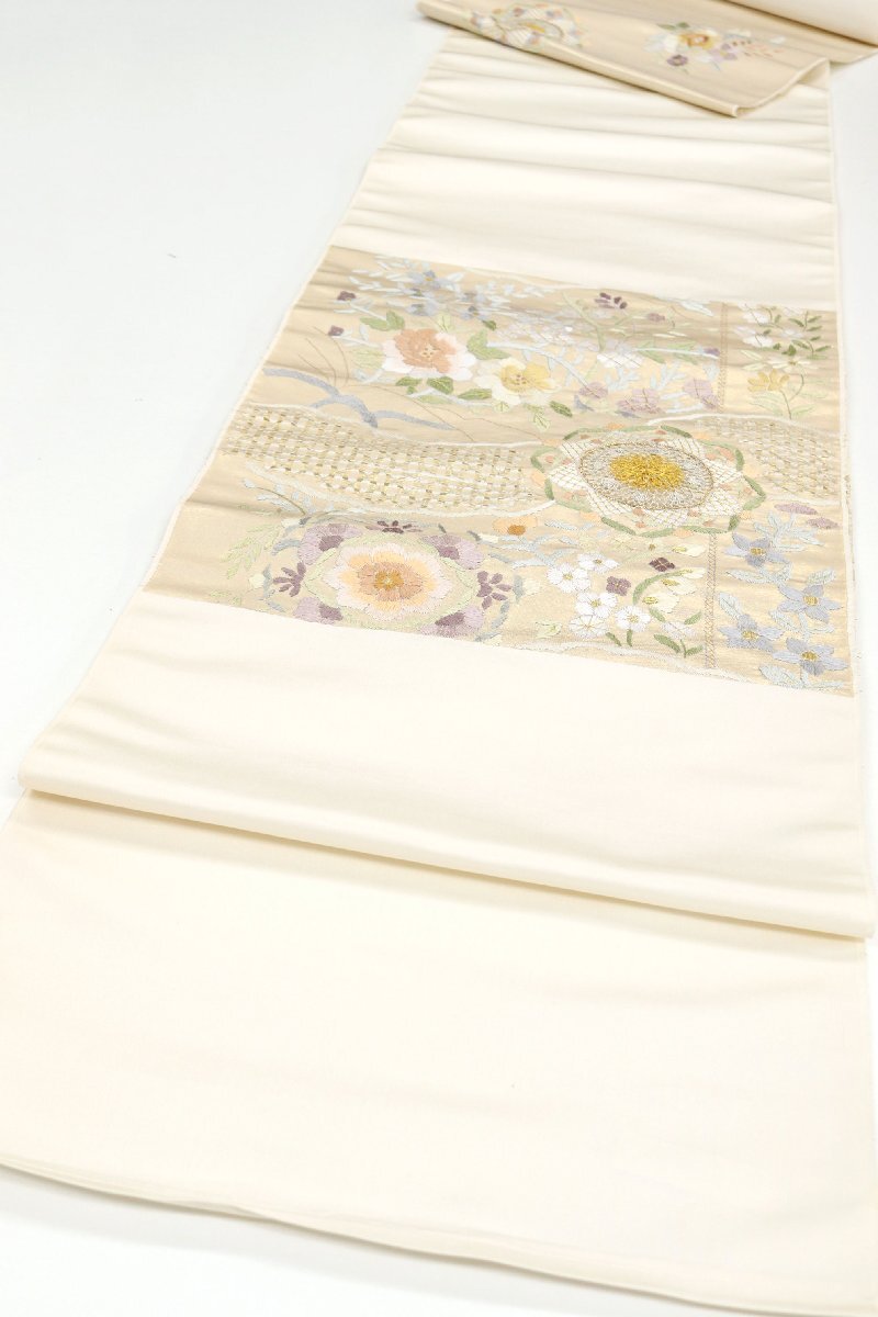 ややハリのある帯地はオフホワイトのお色目でございます。