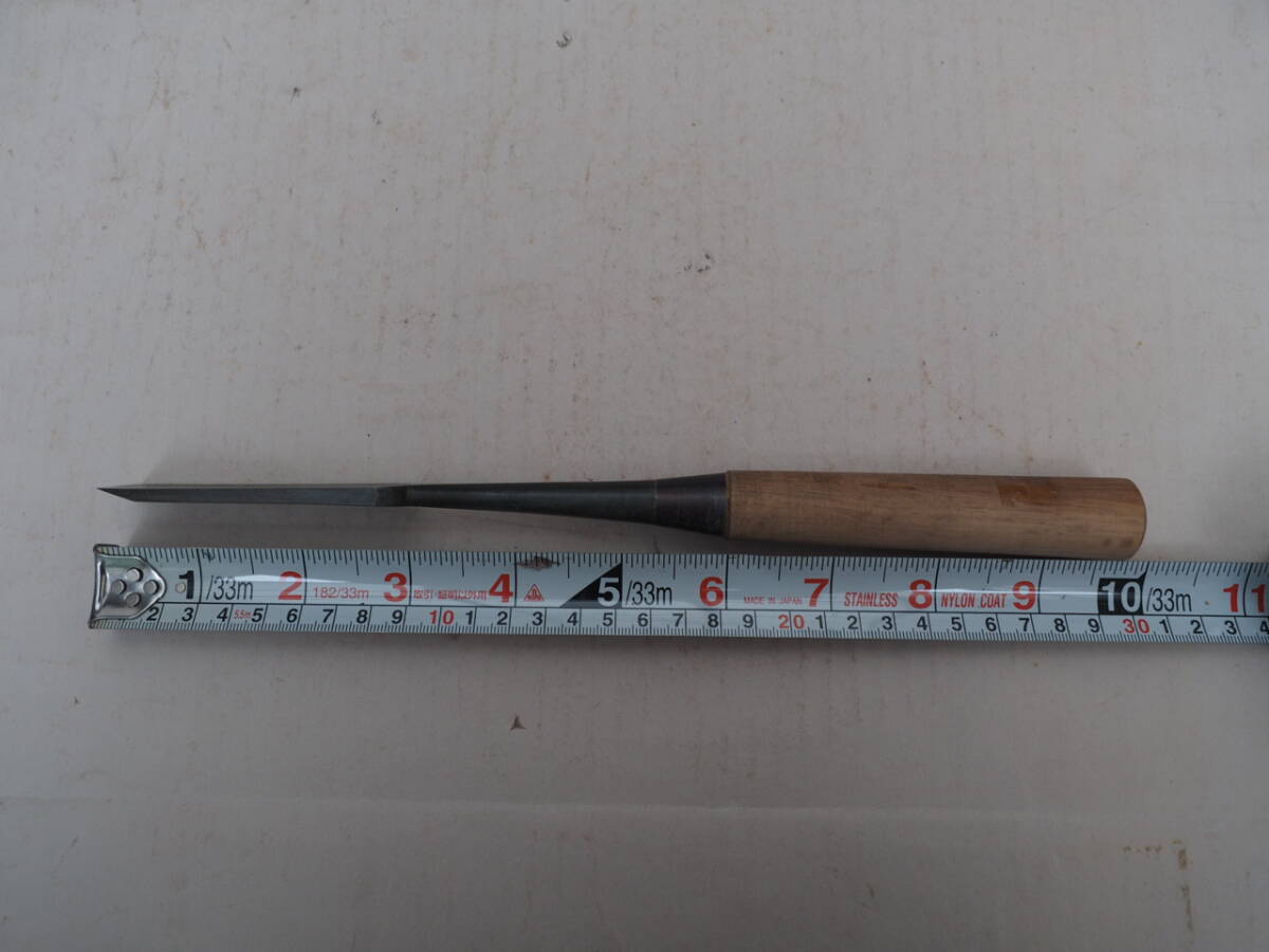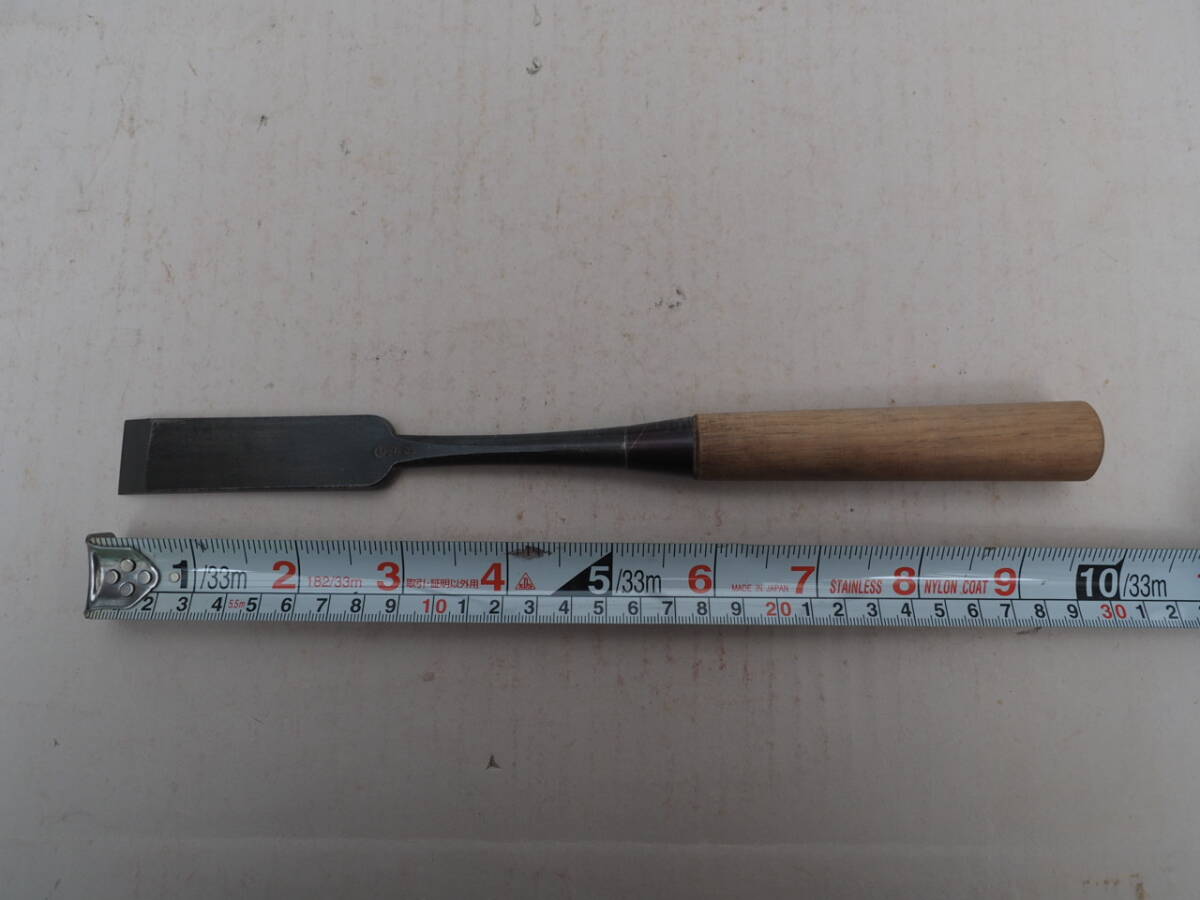 弘正作8分うす鑿 全長 296㎜位 穂の長さ 87㎜位 首の長さ 72㎜位 厚み 元(6㎜位) 先(4㎜位)  汚れ有り    柄に日焼け汚れ有り