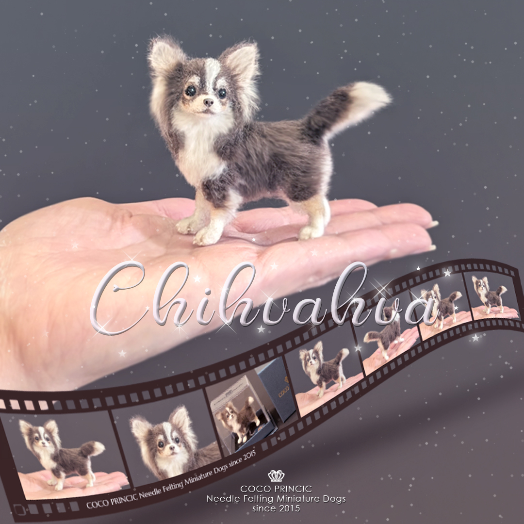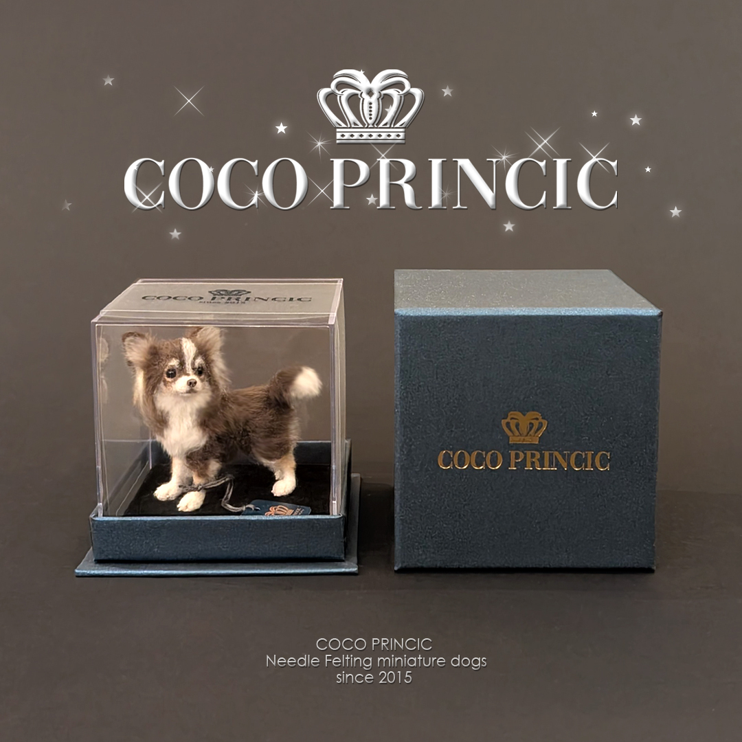 COCO PRINCICを象徴する小さなチワワさん、チョコタンホワイトの子の登場です。 作品のおおきさは約1/6スケールのミニチュアサイズで制作しておりますので、ブライスなどドールのお友達や、ジオラマ・ドールハウスの愛犬としてもお楽しみいただけます。お箱には、ラメを散りばめたミッドナイトブルーを選びました。