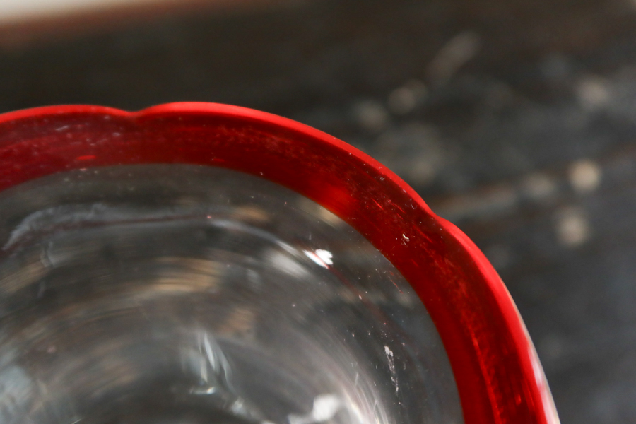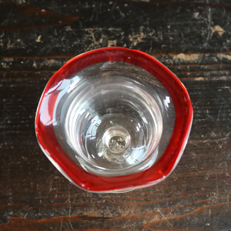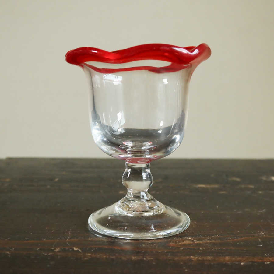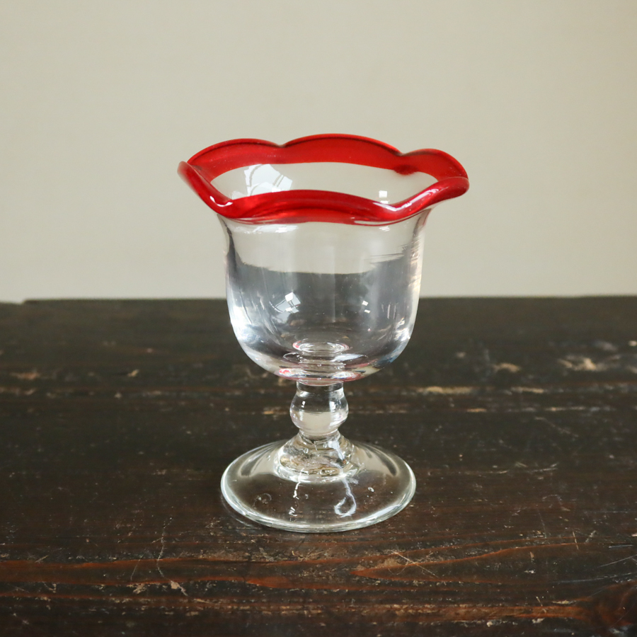 ●英国コレクター 大正ガラス 4 氷コップ 赤縁 フリル 花形 脚付 検) 昭和 和ガラス レトロ アンティーク 明治 大正 硝子 気泡 電笠