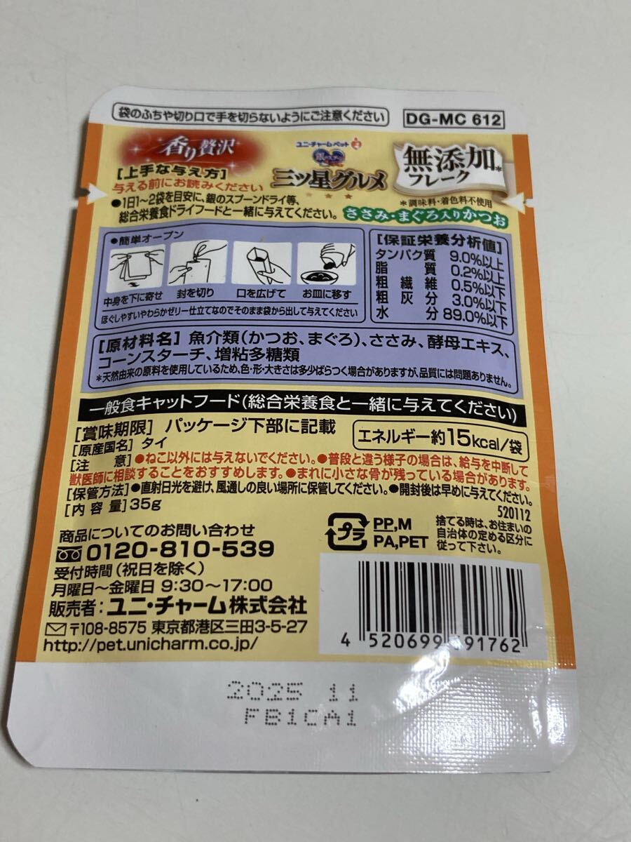 Product name: 【残りわずか】ユニチャーム 銀のスプーン 三ツ星グルメ 無添加フレーク 35g パウチ 32袋 猫
