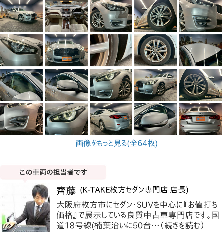 K-TAKE枚方店は国産セダン・SUV・ステーションワゴンを中心に取り扱いしております。趣向性の高い車種になりますので、専門知識を持ったスタッフにてご案内させて頂きます。コーティングやカスタム等はもちろん、任意保険、オートローンまで安心のカーライフをお約束致します。整備、保証などのアフターサービスも当店ですべて行えますのでご安心ください。当社は全国のオークション会場、約160カ所と業務提携を結んでおります。全国60000台以上の中古車を当店でご商談、ご契約、ご納車可能です!
