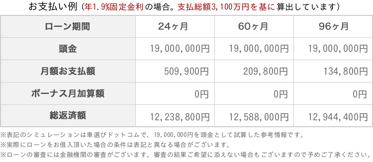 シミュレーションの計算は、オークションの開始価格と参考諸経費を合算した金額を基に算出しています。実際の購入元金とは異なる場合がございますので、予めご了承ください。