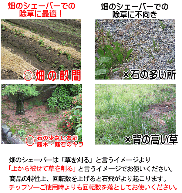 ※畑のシェーバーは、「草を刈る」と言うイメージより、「上から被せて草を削る」と言うイメージでお使いください。 背の高い草を除草する際には、刈払チップソー、刈払刃等をお使いください。