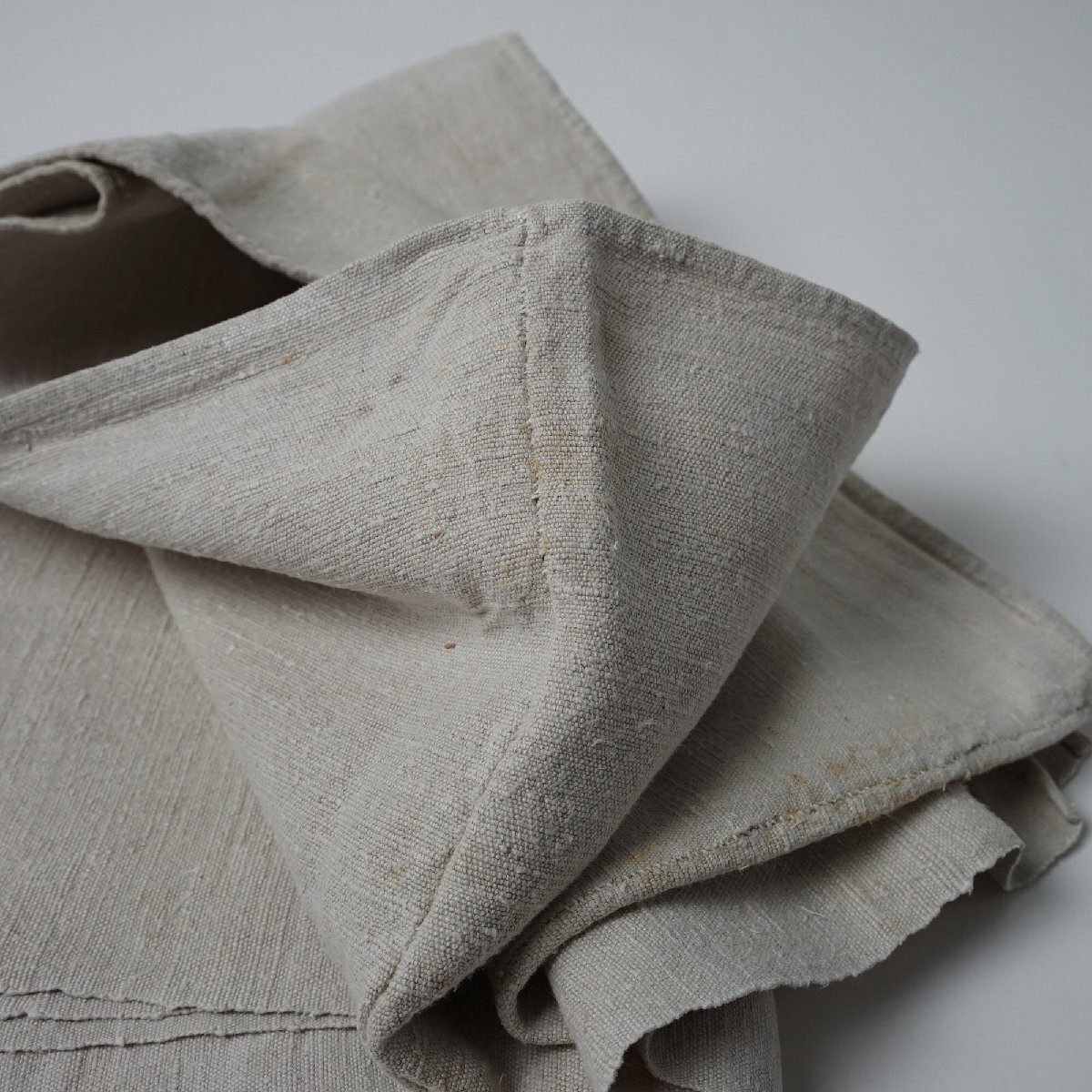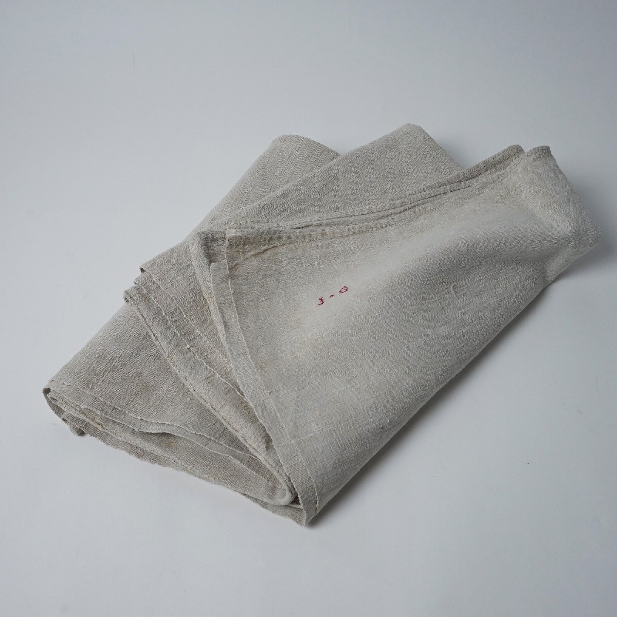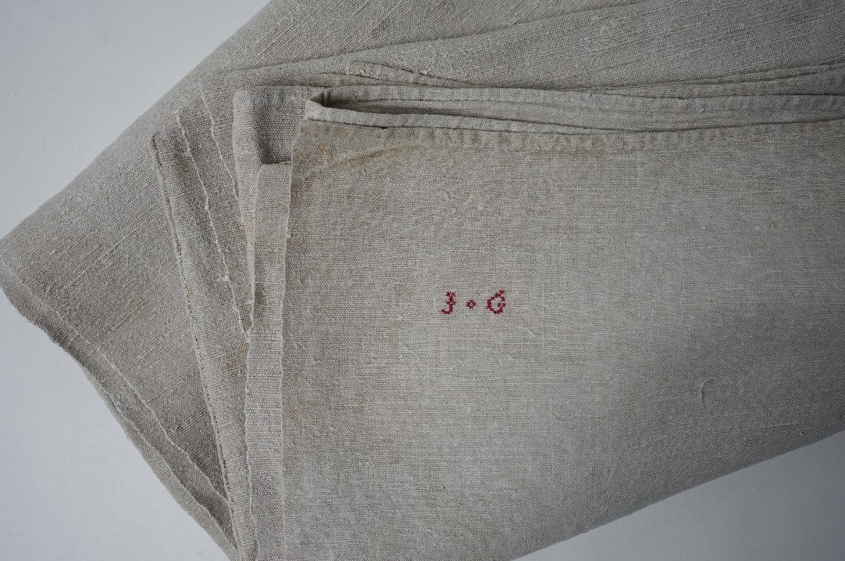 ○素材:フランスアンティーク 手織りシャンブルリネンのシーツです。織り幅の狭い織り機で織らているので2枚を接いで出来ています。フチなど丁寧に手縫いで仕上げられています。裾に赤いイニシャルの刺繍があります。フランス購入品です。