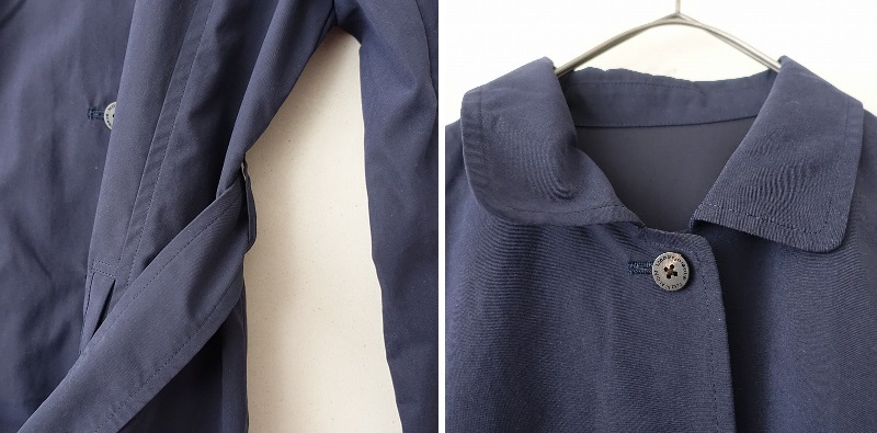 Mademoiselle NON NONのベルト付きコートです。カラーはネイビー、やや薄手素材で、フロントボタンです。前両腰にポケットがあり、裏地はなく、ウエストにループ&紐が施されております。