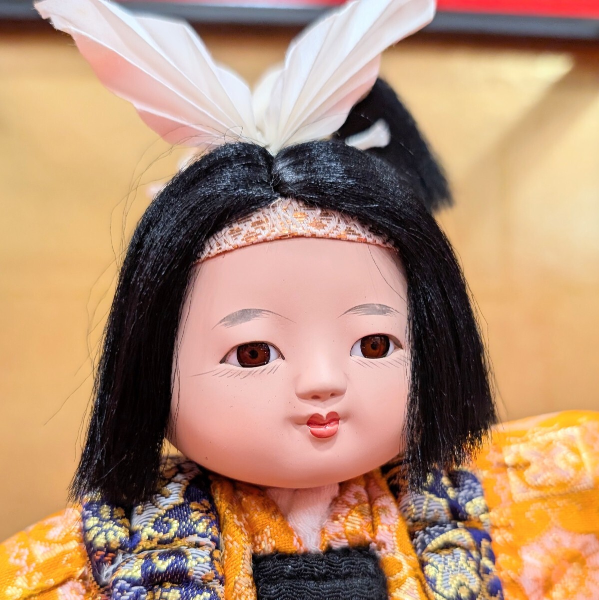 人形の着物は金蘭で朱色と青色の生地がキラキラしており、綺麗で迫力があります。