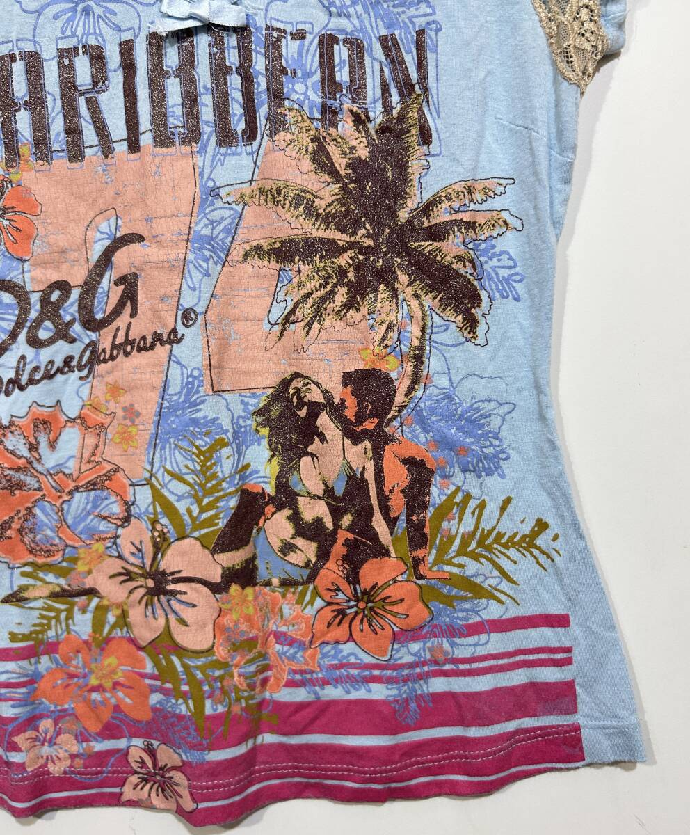 ▼イタリア製 オールド D&G レース切替 Vネック カットソー ラメ ロゴ 海外ガール水着 プリント チビT ハイビスカス ライトブルー Y2K