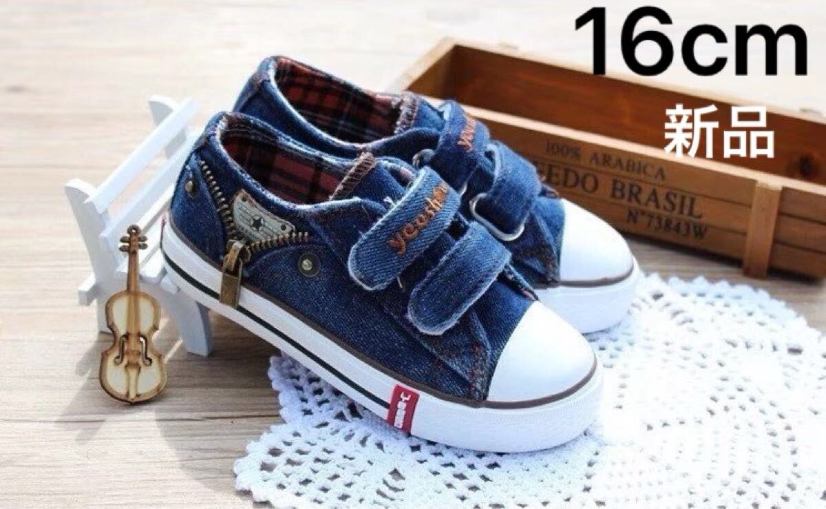 新品、キッズ、幼児靴●御洒落スニーカ●帆布●ダークブルー 16cmマジックテープ、送料無料、ラスト一点!l