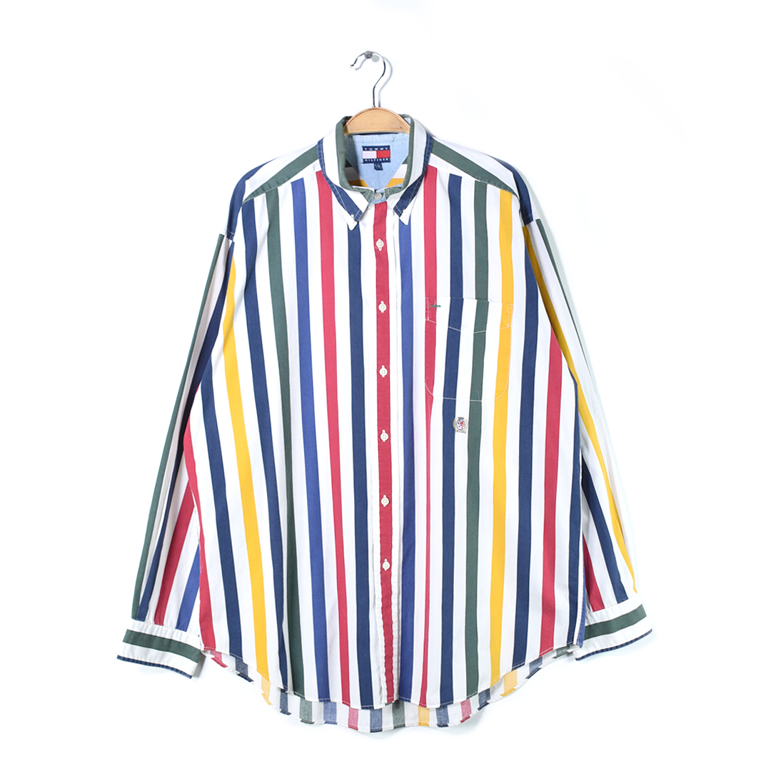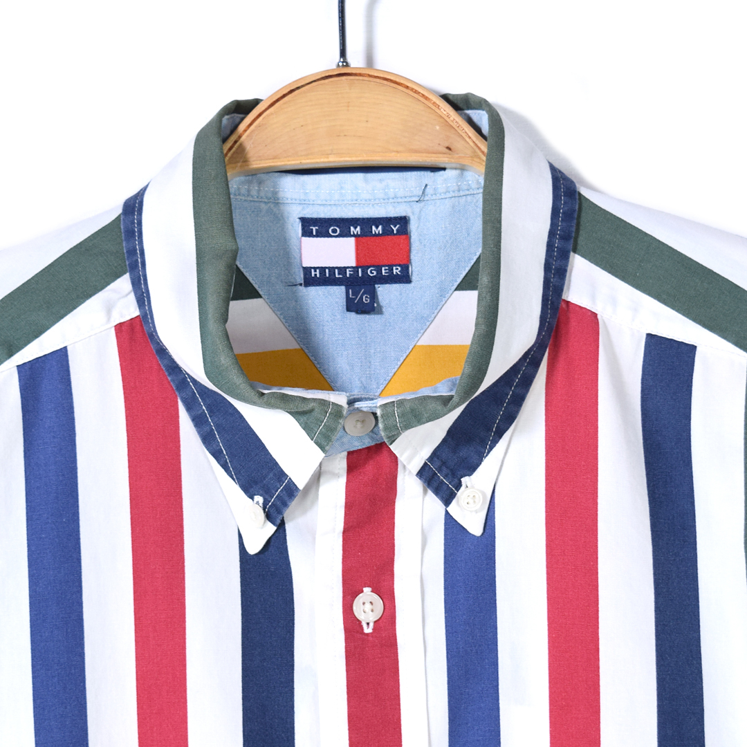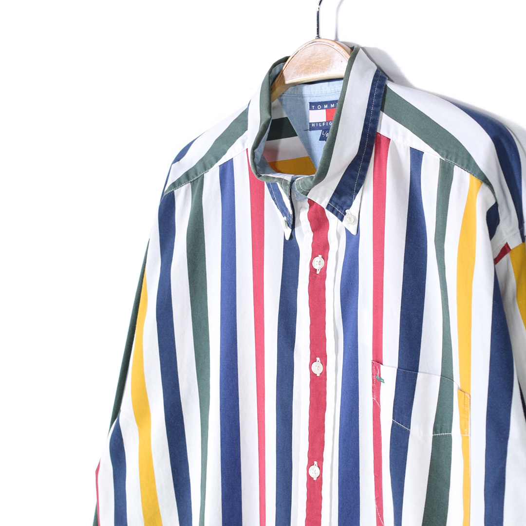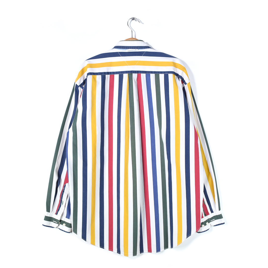 Product name: 【送料無料】90s トミーヒルフィガー マルチカラー ボタンダウンシャツ ストライプ エンブレム 旧タグ オールド メンズL 古着 @CA1461