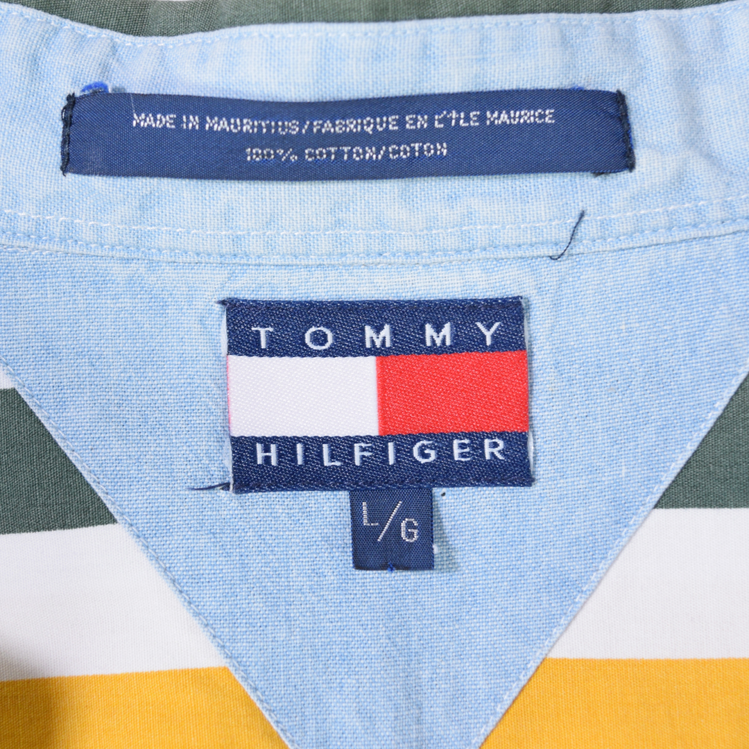 【送料無料】90s トミーヒルフィガー マルチカラー ボタンダウンシャツ ストライプ エンブレム 旧タグ オールド メンズL 古着 @CA1461