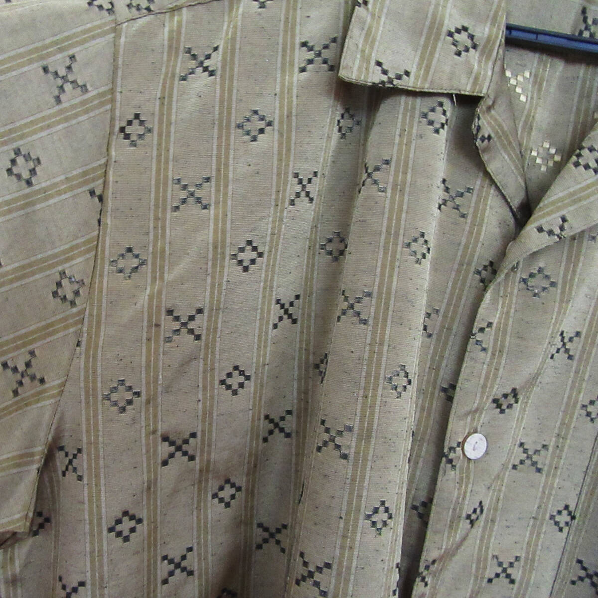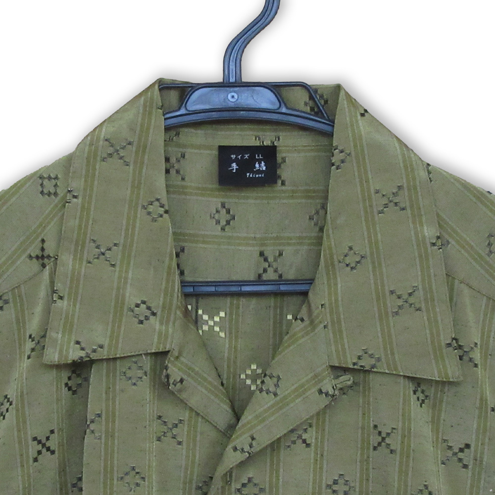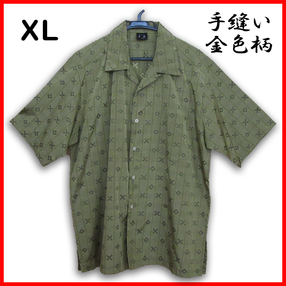 【一点物】手縫い 黄金色 かりゆしウェア LL/XL 開襟シャツ 光沢 金色柄