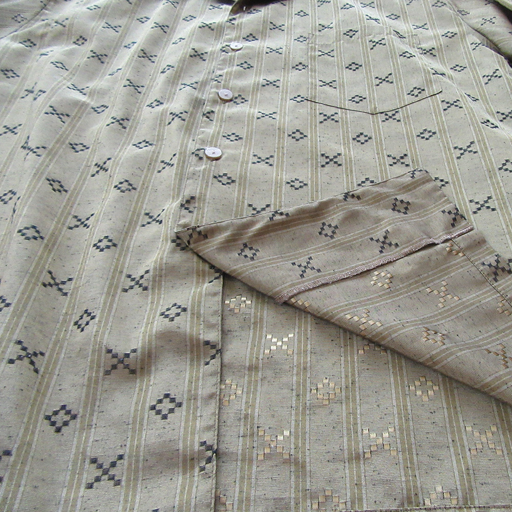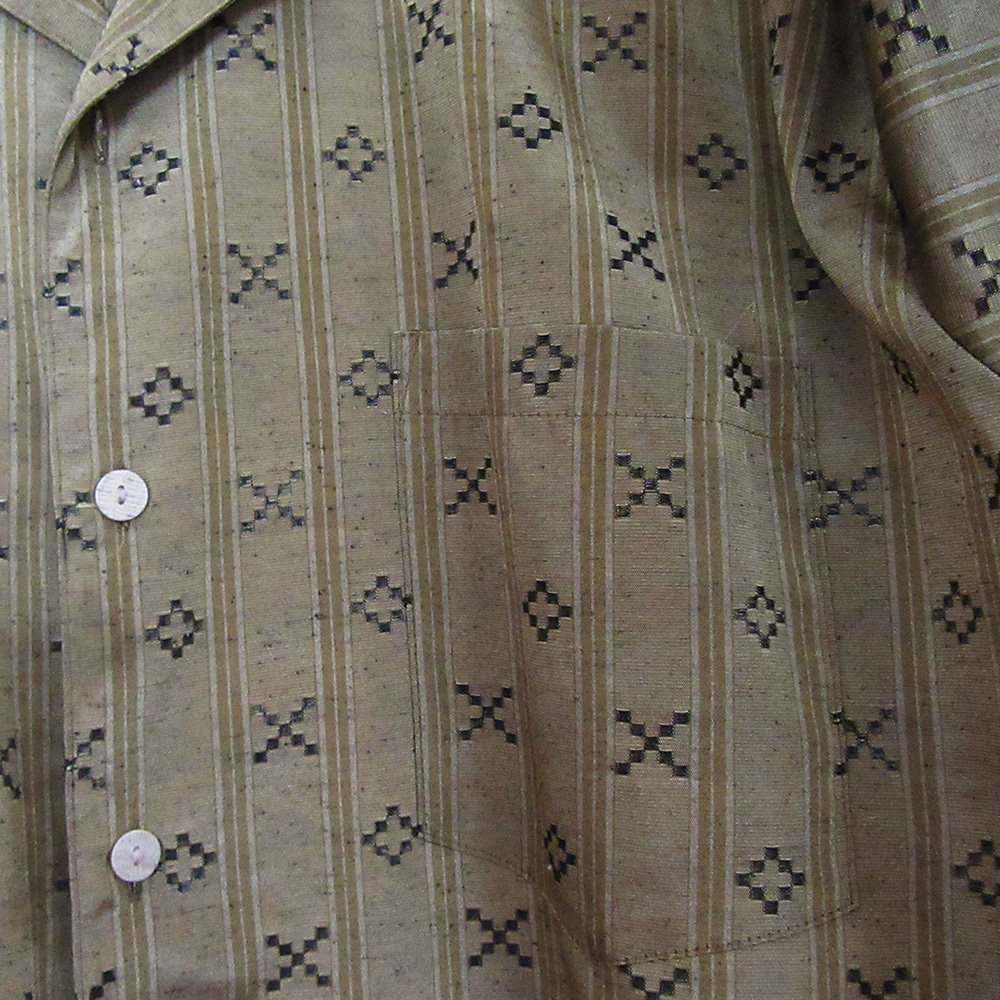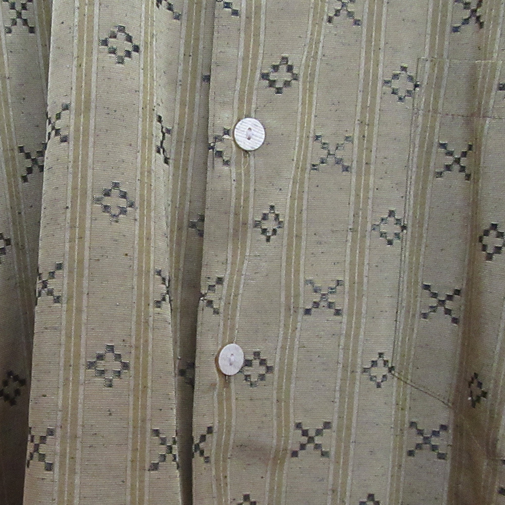 【デザイン・特徴】 金色の光沢が存在感を放ち、開襟デザインが上品でリラックス感のあるスタイルを演出します。細部までこだわったおしゃれなボタンもポイント。手縫いならではの耐久性があり、長く愛用できる一枚です。