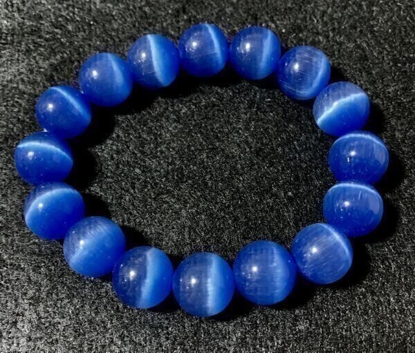 美しい藍色、インディゴカラーの大粒キャッツアイブレスレットです。とても綺麗で、これ好きです。キャッツアイは、邪悪なものや人からの悪意を寄せ付けない効果があるとされ、魔よけのお守りとして珍重されてきました。タイガーアイとともに、古代から「魔除けの邪眼」として用いられました。集中力を高める効果もあり、勉強には最適な石です。身に着けると、ビジネスなどで先を見通す力をもつことができるといわれています。一粒約12ミリで実際に装着した時の内周は16.5センチです。