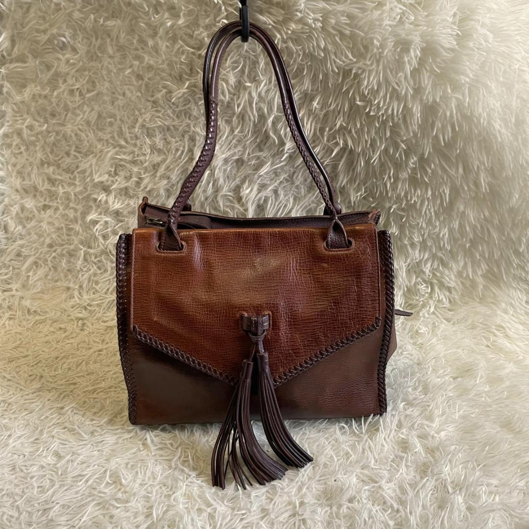 Product name: genten ゲンテン タッセル装飾 レザー トートバッグ 本革 肩掛け フリンジ 編み込み A4サイズ ブラウン レディース カジュアル