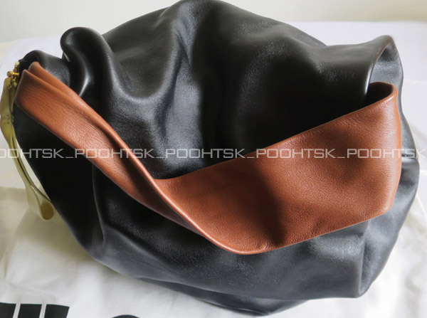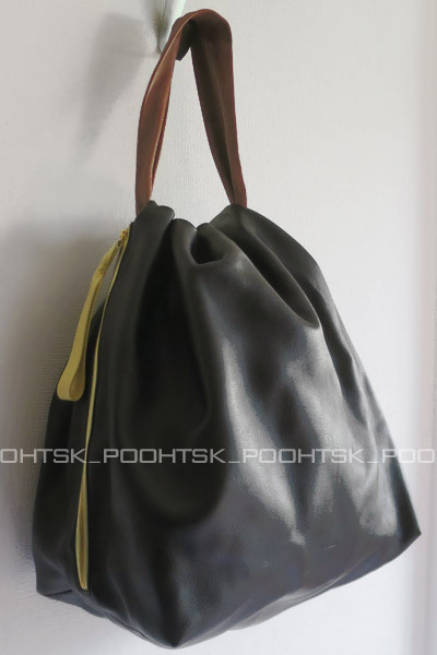 ブラックのソフトなスムースレザーにブラウンとバタークリームのコントラストカラー、ハンドルでラッシュされるフォルム、おしゃれでとても素敵なバッグです☆