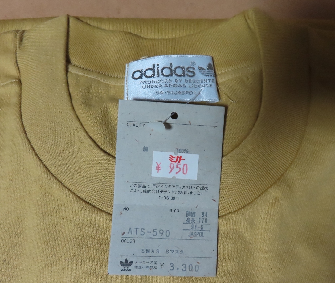 〓★20-30年位昔の未使用Tシャツ■胸囲94、身長170★〓アディダス adidas/ATS-590〓黄土色 綿100%〓デサント/DESCENTE