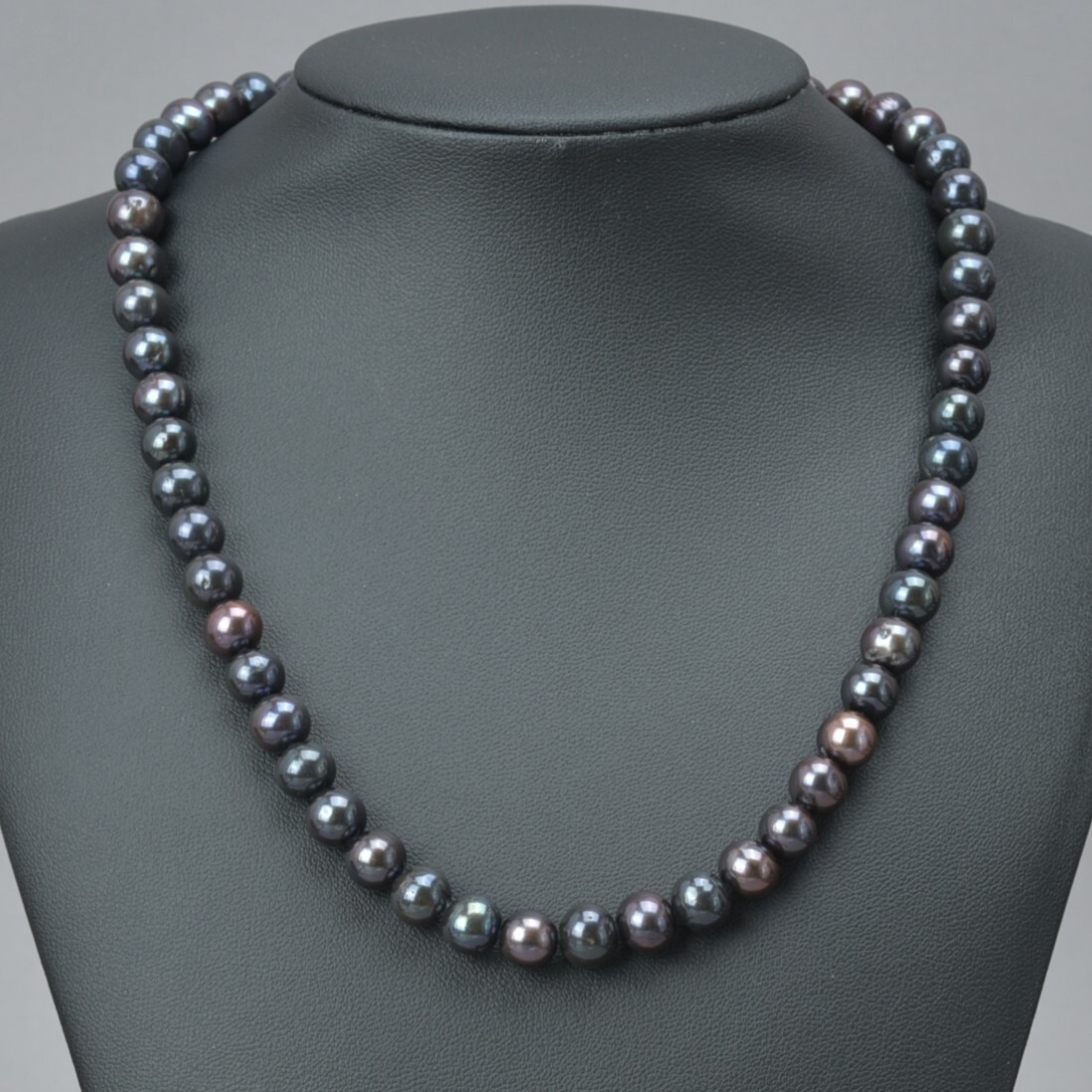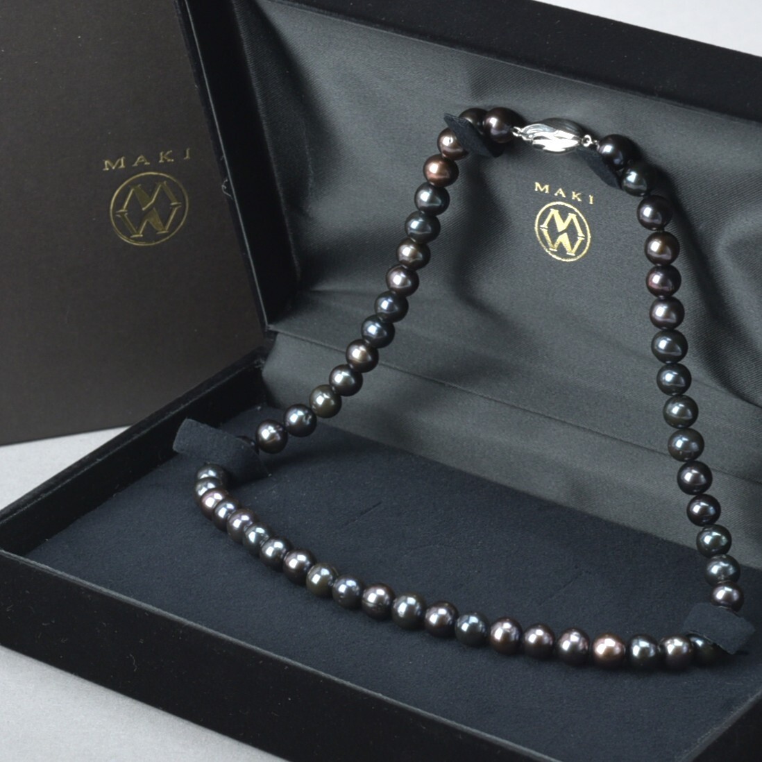 美品 ジュエリーマキ 本真珠 パールネックレス パール幅8.1mm 重さ38.2g 長さ42.5cm ブラック ケース付 SILVER/GSV刻印 #60※0626-39/TLa.d