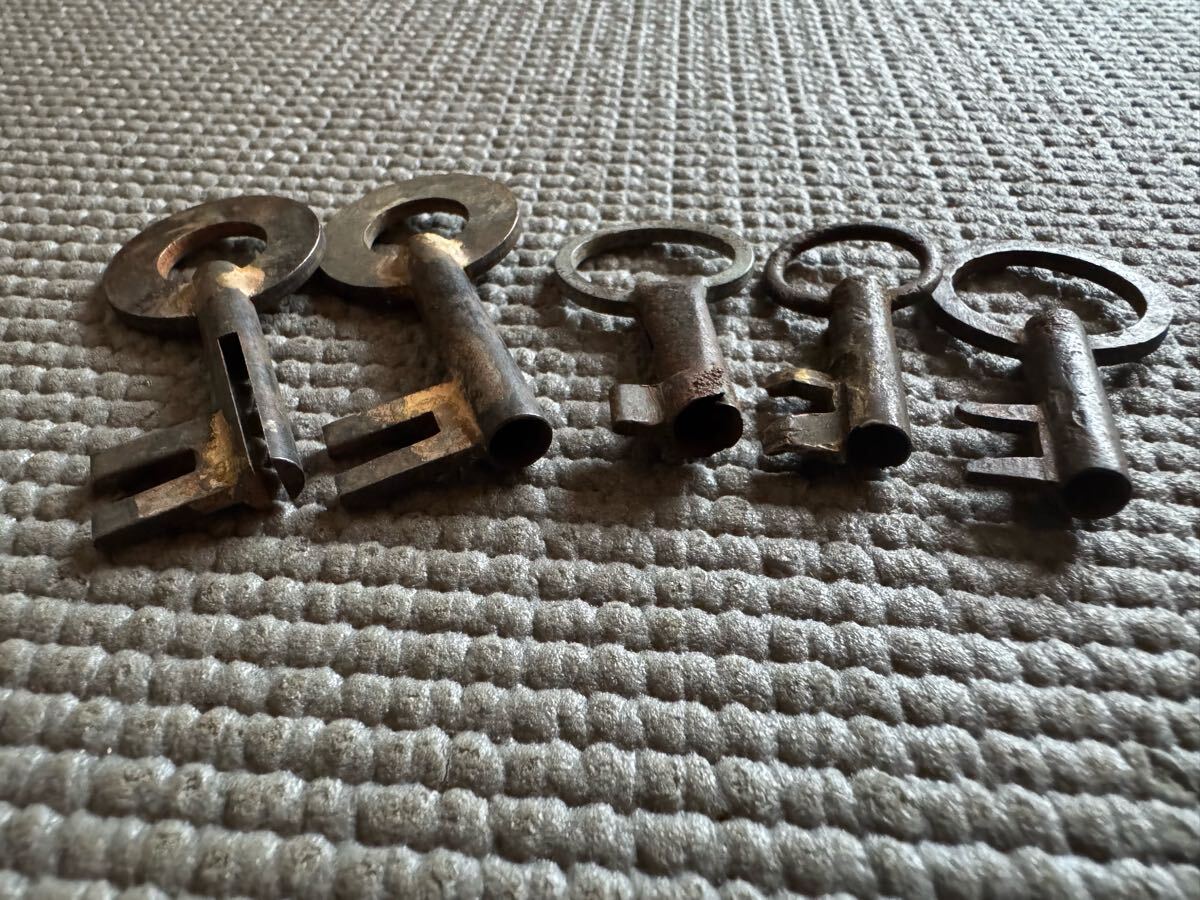 ☆7 倉庫片付け品 中古 レトロな錠前 5個セット 古い箪笥 子引き出し等の鍵 画像参考。 状態、汚れ、サビ、イタミ、他に見落とし等が有るかも 商品画像参考判断にてお願い致します。