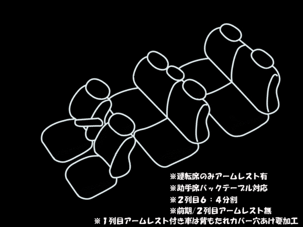 適合形状:運転席アームレスト有 2列目アームレスト無 助手席バックテーブル対応