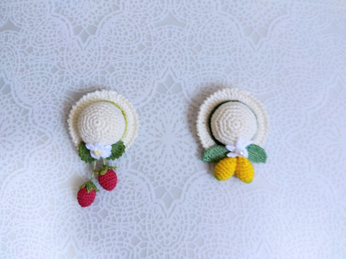 ハンドメイドレース編み 麦わら帽子ブローチ 2点セット